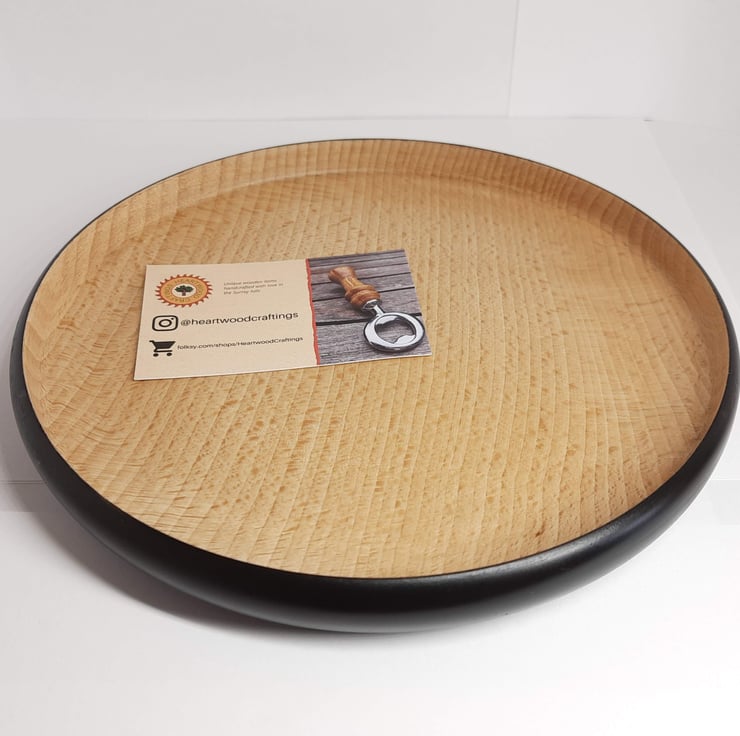 This is a woodturned platter or dish. It is made by hand on a lathe from a piece of Beech wood. The inside is wonderfully detailed and intricate Beech wood, which curves up to meet the rim. The outside of this shallow bowl is finished with ebonising lacquer which provides an incredible contrast with the lighter natural wood of the interior. The outside shape is curved with an undercut to the foot, giving the exterior an illusion of significant depth.