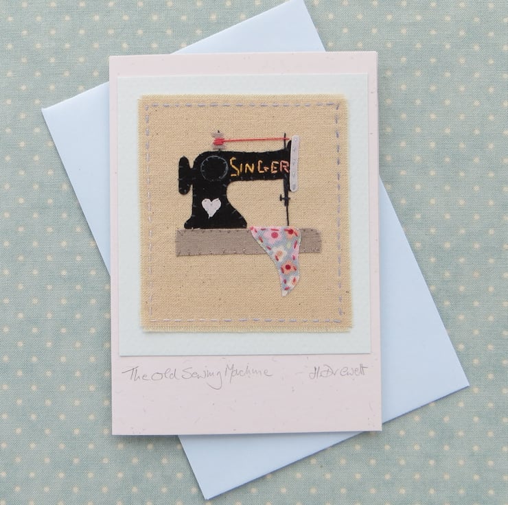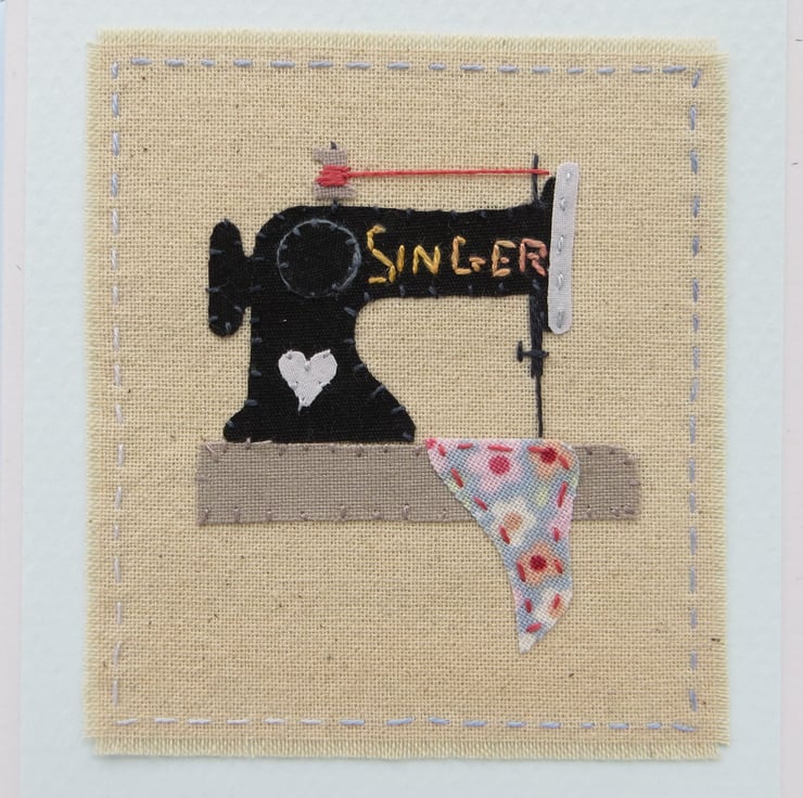 A unique hand-stitched miniature applique of old Singer sewing machine, with embroidered details including the Singer name. There is a lot of fine stitchwork in this miniature embroidery, definitely a card to keep!