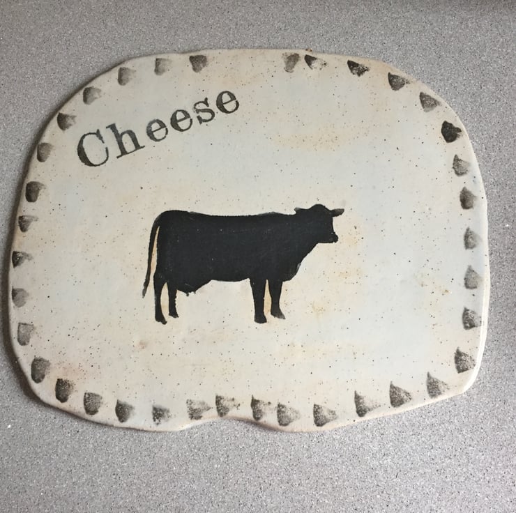 Ceramic cheeseboard decorated with a cow! 10 inches (25cms) by 9 inches (23cms). With added rubber feet to the underside to protect your table.