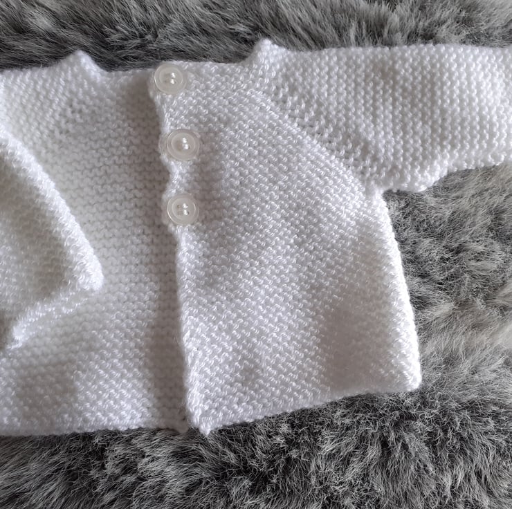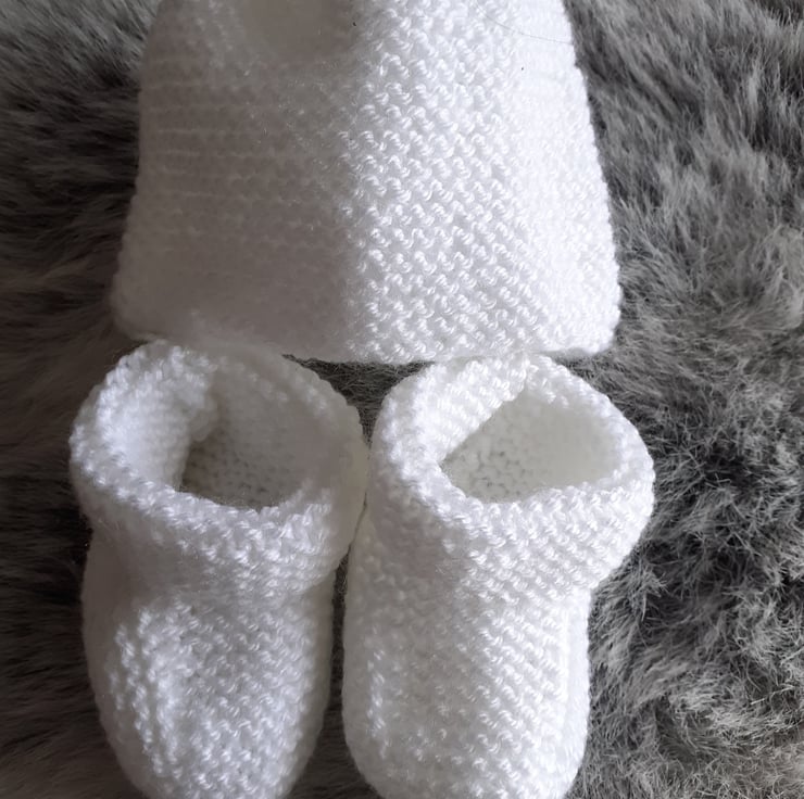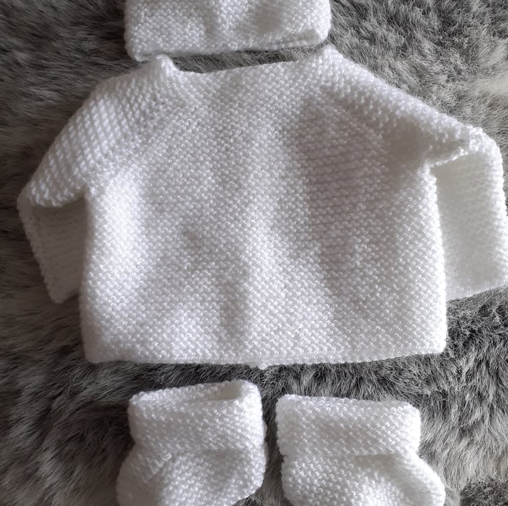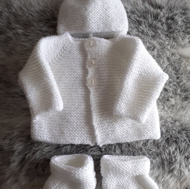 Hand knitted matinee set for a newborn baby. Knitted in an acrylic double knitting yarn in a garter stitich pattern the set comprises of a jacket, hat and bootees..