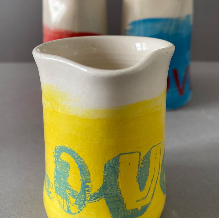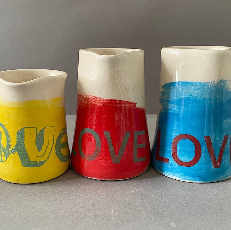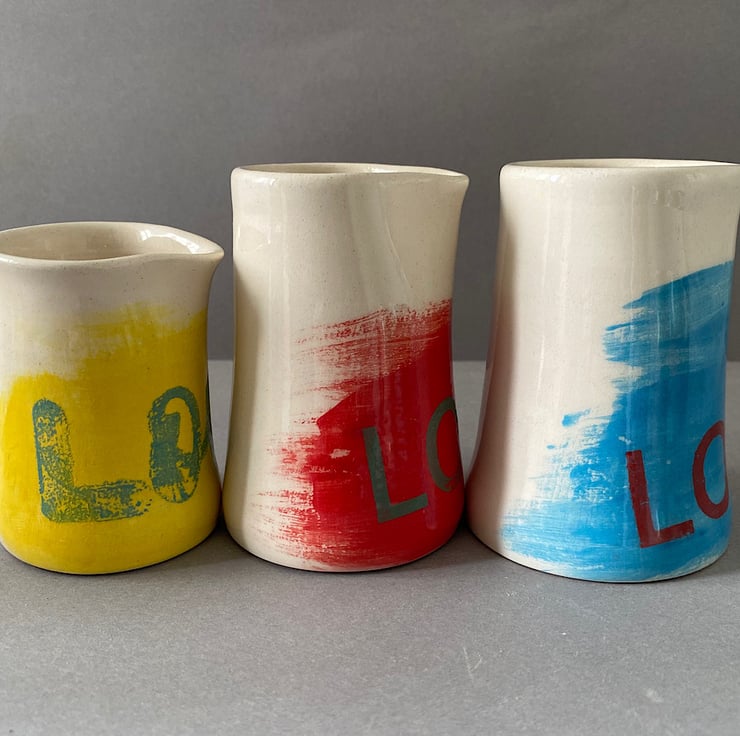 Cream/White earthenware ceramic pourer/jug set. Hand thrown on my little pottery wheel. Dipped in a transparent clear glaze. Each pourer features a handmade, screen printed Love design.