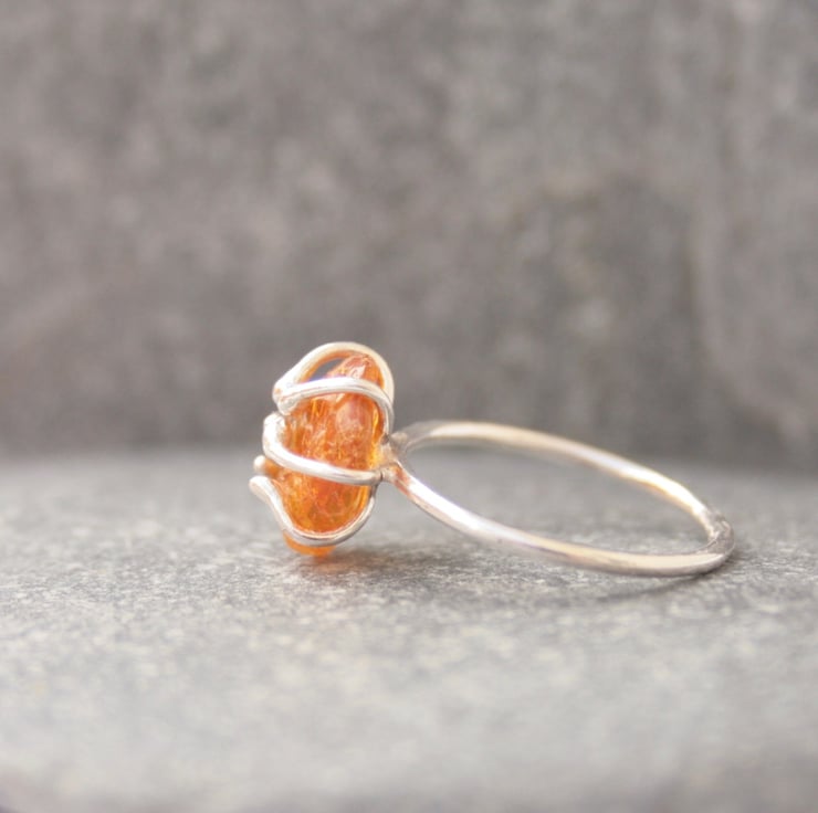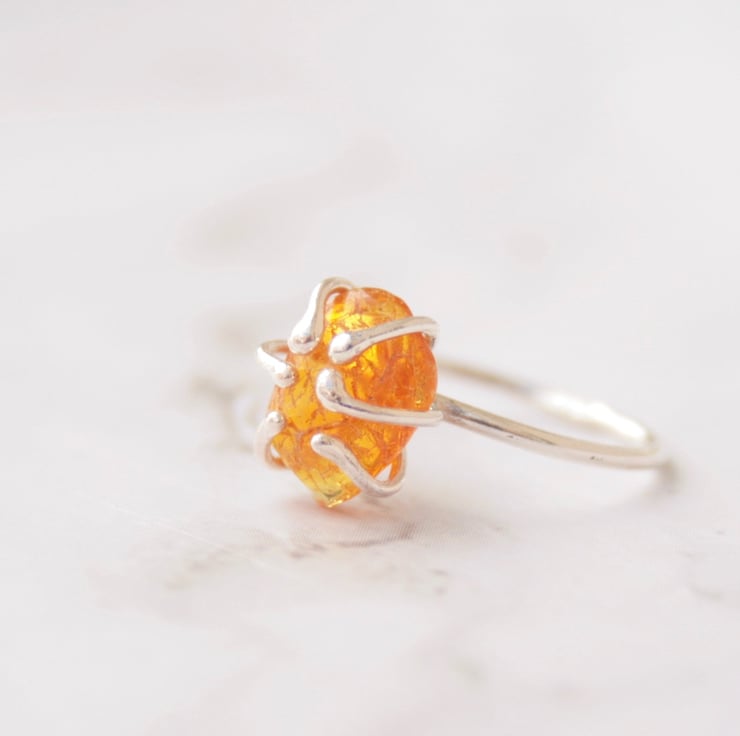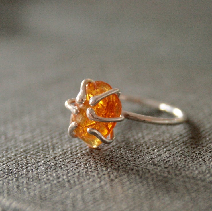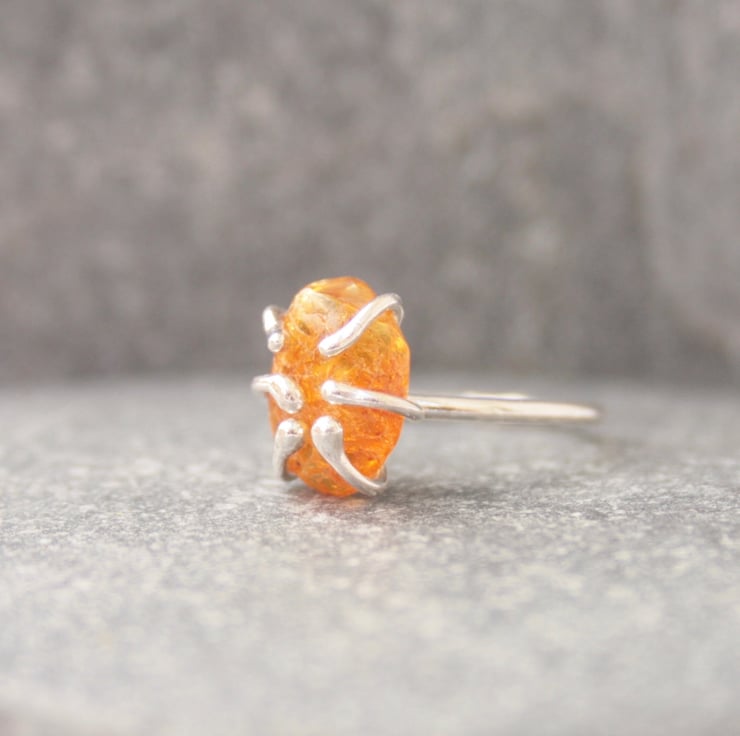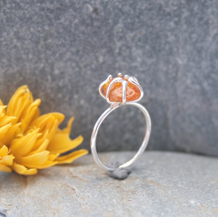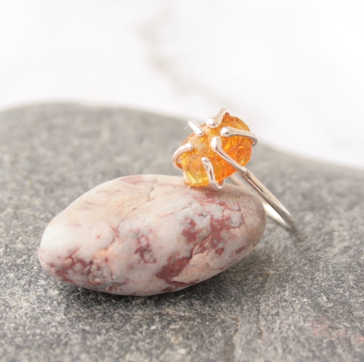 I have created this handmade gemstone ring using a raw nugget of amber which is held in place with 6 claws of sterling silver. Each ring will be a unique piece of jewellery due to the fact that no two nuggets of amber will be the same shape or colour.