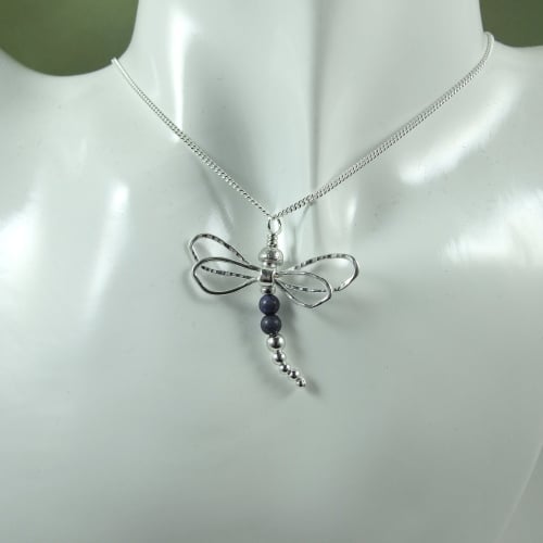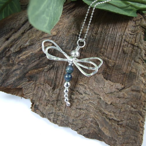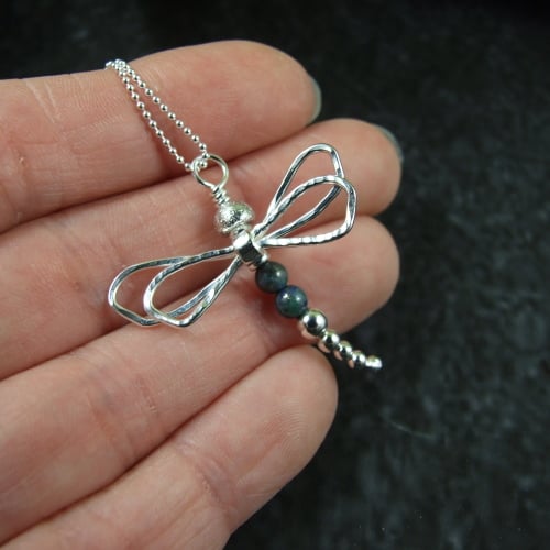 I have made the wings using sterling silver wire, entirely crafted by hand shaped and soldered. The body is made from graduated size sterling silver beads with two 4mm chrysocolla beads for the body. Fitted to 18 inch .925 Sterling Silver Chain.