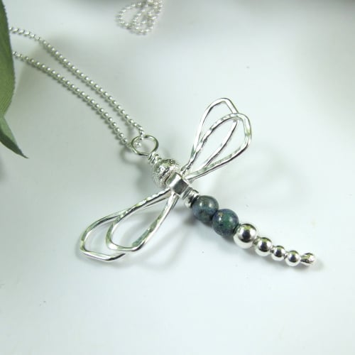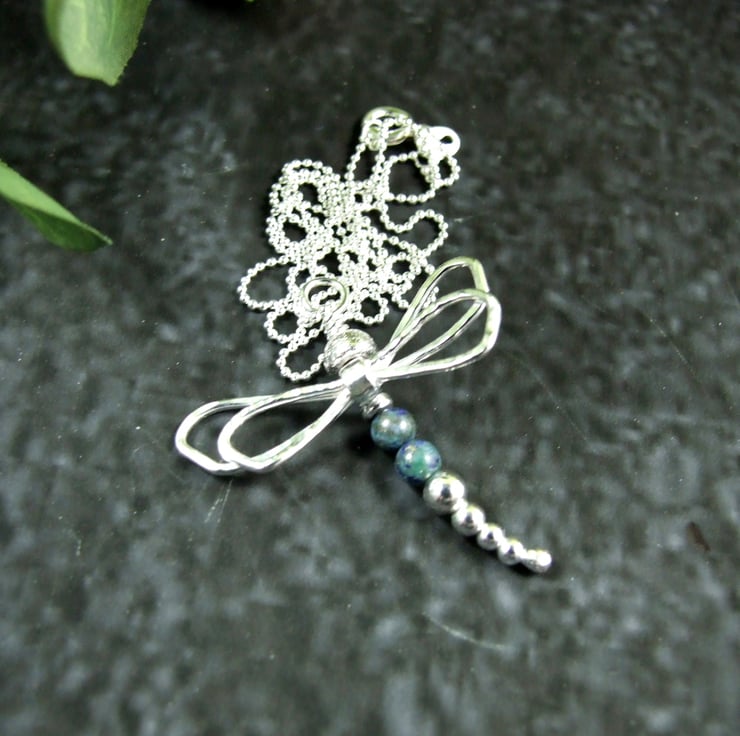 Dragonfly Necklace. Handcrafted Sterling Silver Dragonfly with chrysocolla gemstones.