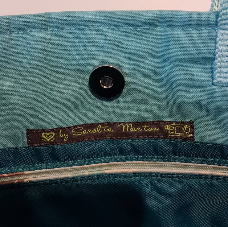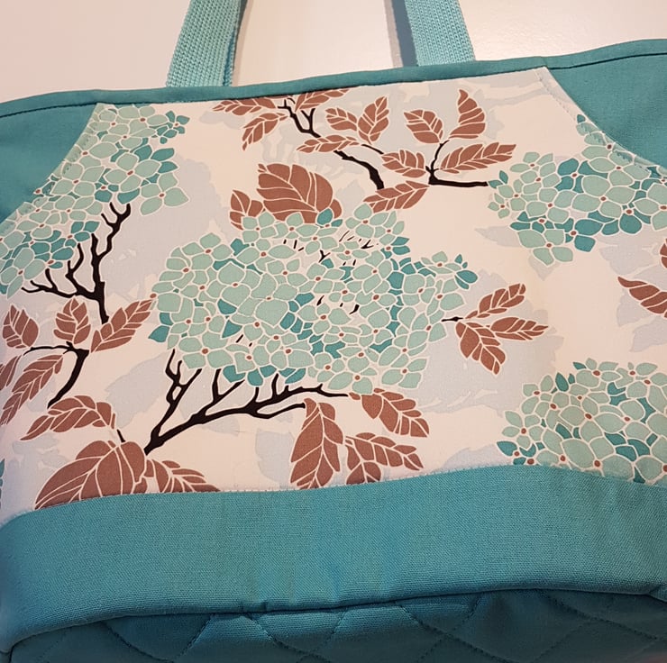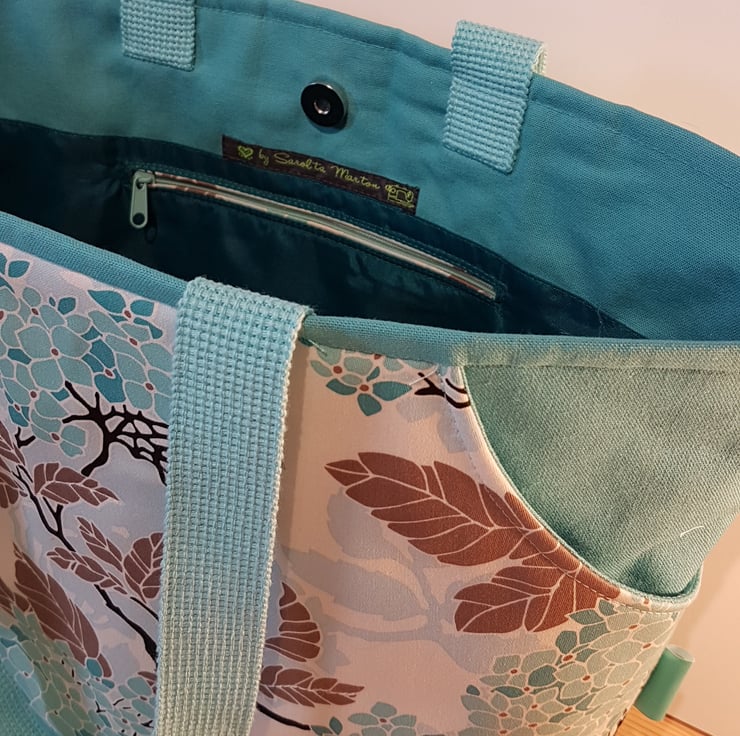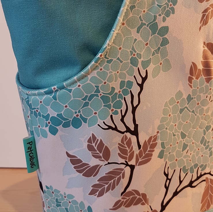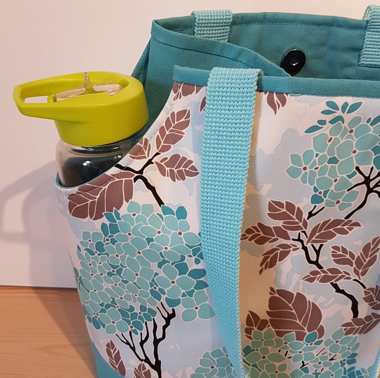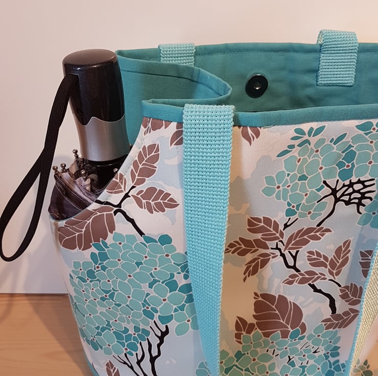 Handcrafted tote bag with drink holder pockets on both sides on the bag. Also can use this two long pocets for umbrella.( see the pictures)The pockets and the bag itself has waterproof lining. The bag has a normal pocket inside with zipper closure, useful for bank card or keys, etc. The bag has magnetic closure. The handles are long enough for wearing on shoulder or can use as a handbag. The tote bag made from cotton fabrics in aqua green,ivory and tobacco brown pattern with beautiful hydrangea pattern. Dimensions: hight: 30cm,width: 44cm on top and 40cm on bottom of the bag,15cm depth on the bottom of the bag. The two handle are 62cm long. The drink bottle an umbrella on the pictures display only,not included :)