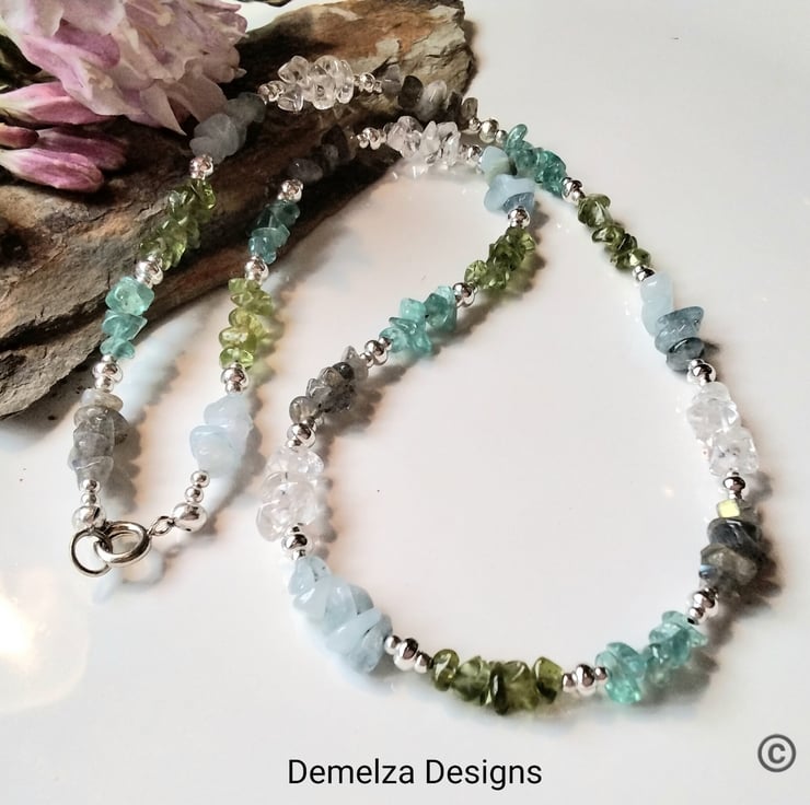 A lovely vibrant sparkley necklace designed and hand crafter using quality aquamarine, peridot, labradorite, pariaba blue apatite and clear quartz nugget gemstones. Between each gemstone change station are quality 2mm and 4mm silver plated beads. This necklace has a beautiful natural sparkle during wear as any light source hits the gemstones. For the main construction professional coated stainless steel jewellers wire has been used for added strength and lasting durability, finished off with a quality silver plated 7mm bolt ring clasp.