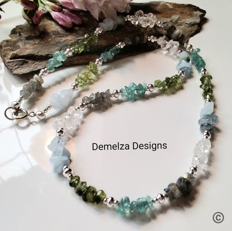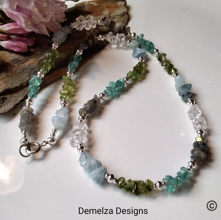 A lovely vibrant sparkley necklace designed and hand crafter using quality aquamarine, peridot, labradorite, pariaba blue apatite and clear quartz nugget gemstones. Between each gemstone change station are quality 2mm and 4mm silver plated beads. This necklace has a beautiful natural sparkle during wear as any light source hits the gemstones. For the main construction professional coated stainless steel jewellers wire has been used for added strength and lasting durability, finished off with a quality silver plated 7mm bolt ring clasp.