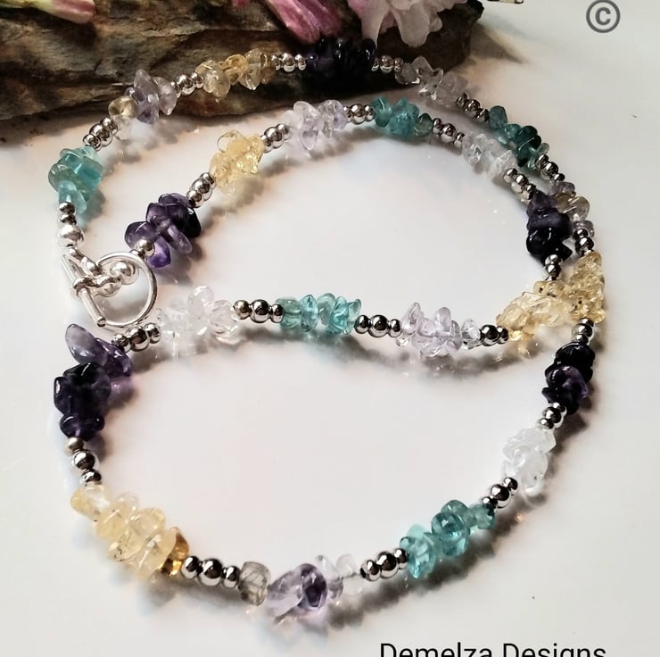A lovely vibrant sparkley necklace designed and hand crafter using quality amethyst, amatrine, peridot, citrine, pariaba blue apatite and clear quartz nugget gemstones. Between each gemstone change are quality 2mm and 4mm silver plated beads. This necklace has a beautiful natural sparkle during wear as any light source hits the gemstones. For the main construction professional coated stainless steel jewellers wire has been used for added strength and lasting durability, finished off with a quality silver plated 12mm round toggle style clasp.