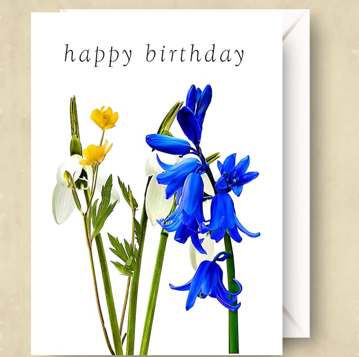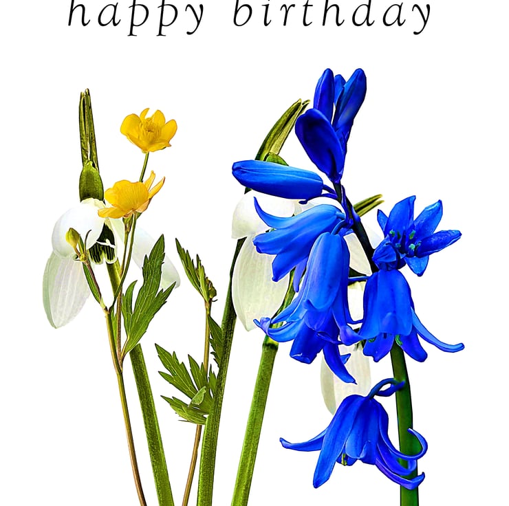 This Birthday card is printed on 310gsm Inkjet Card, from Paper Spectrum. It has a mixture of Flowers; Bluebells, Snowdriops and Buttercups; with the words "Happy Birthday" written on the front.