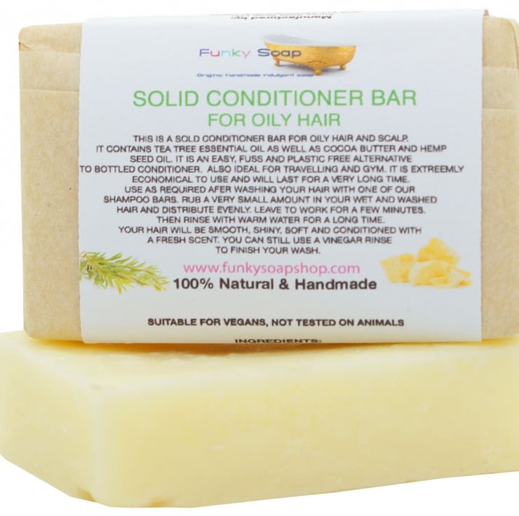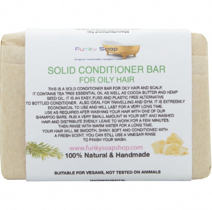 This is a solid conditioner bar for oily hair and scalp. it contains tea tree essential oil as well as cocoa butter and hemp seed oil. It is an easy, fuss and plastic free alternative to bottled conditioner. Also ideal for travelling and gym. It is extremely economical to use and will last for a very long time. Use as required after washing your hair with one of our shampoo bars. Rub a very small amount in your wet and washed hair and distribute evenly and rinse with warm water. This products is a solid oil and will NOT FOAM and can be used as a leave in conditioner. Your hair will be smooth, shiny, soft and conditioned with a fresh scent. You can still use a vinegar rinse to finish your wash and add extra shine. Please keep out of eyes!