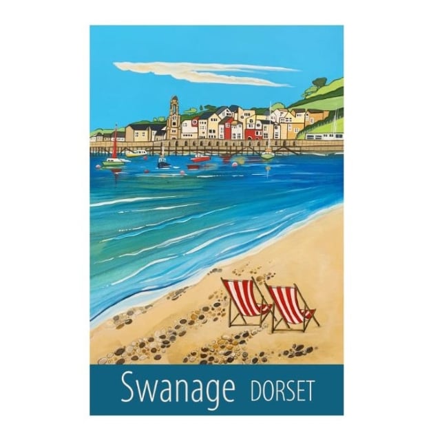 A contemporary travel poster style print of the Dorset seaside town of Swanage, from my own original acrylic painting.