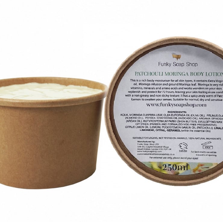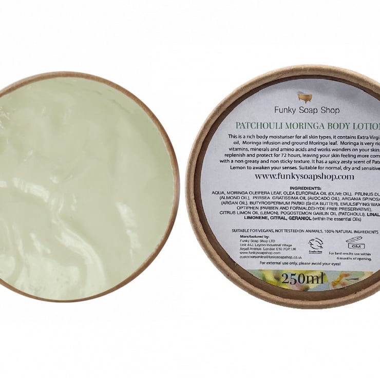 This is a rich body moisturiser for all skin type, it contains extra virgin olive oil, moringa infusion and ground moringa leaf. Moringa is very rich in vitamins, minerals and amino acids and works wonders on your skin. It will replenish and protect your skin for 72 hours, leaving your skin feeling more comfortable with a non greasy and sticky texture. It has a spicy zesty scent of Patchouli and Lemon to awaken your senses. Suitable for even the most sensitive skin. This product contains a very small amount of the approved preservative optiphen. Optiphen is a formaldehyde and parben free preservative.Without this the product would not be usable for more than 3 weeks. Please keep out of eyes!