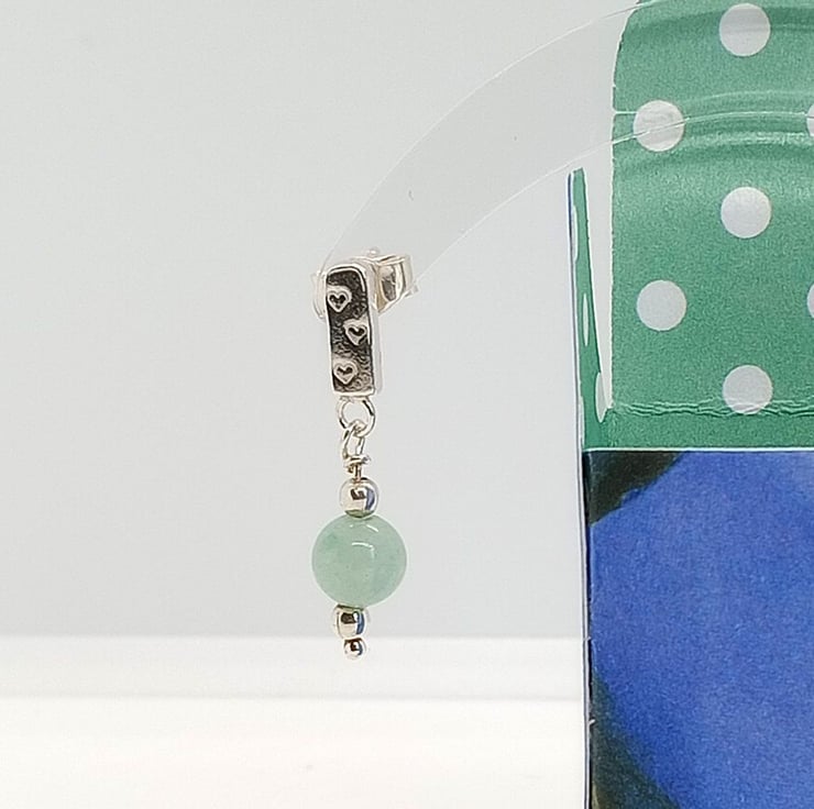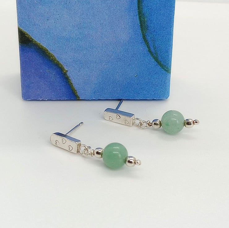 Handmade solid sterling silver .925 bar stud earrings stamped with tiny hearts, suspended from the earrings is a 6 mm round green Aventurine gemstone bead.