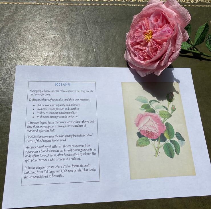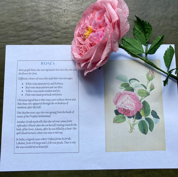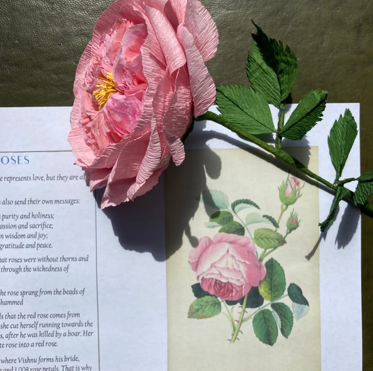 A beautiful handmade pink paper rose. Every petal cut by hand! Come complete with a gift card explaining the significance and mythology behind this spectacular flower! Approx 10cm diameter.