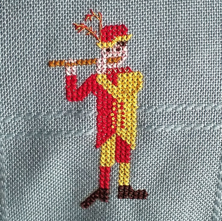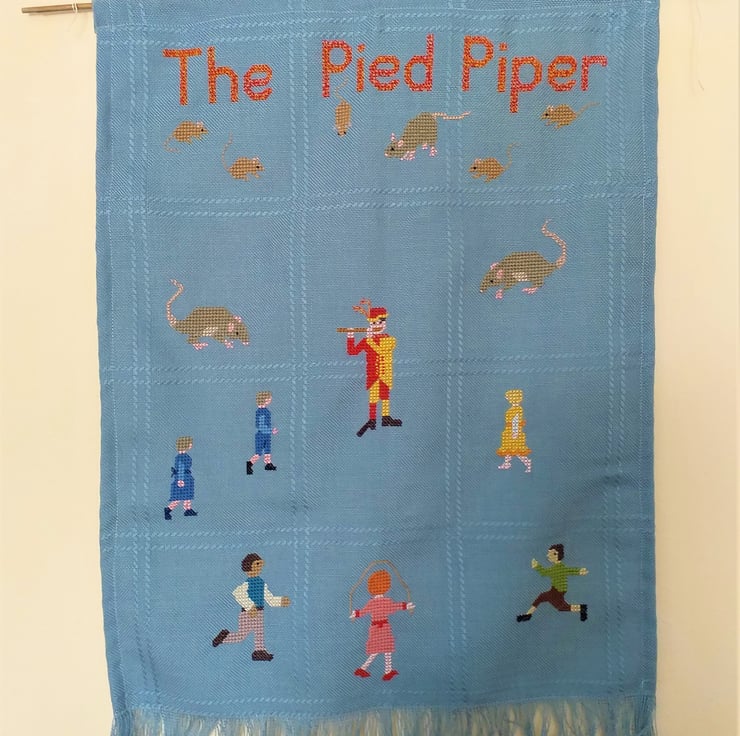 We have a small Folio Society edition of The Pied Piper of Hamelin - a poem by Robert Browning, which I was made to learn when about six or seven years old. I came across it when looking for something else in the bookcase, and thought I could tell the story in stitches. I hope I've succeeded.