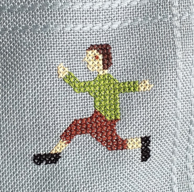 I am very proud of this unique hand embroidered Afghan, representing the story of the Pied Piper of Hamelin. Entirely my own design, it is depicted largely though not entirely, in cross-stitch. The Piper occupies the two centre squares, surrounded above by converging rats, and below by gathering children. The material is a grey-blue even-weave acrylic, which I have hemmed on three sides, and fringed on the fourth. The top hem is open at the ends, to allow the insertion of a dowel for hanging. (The dowel is not included.)