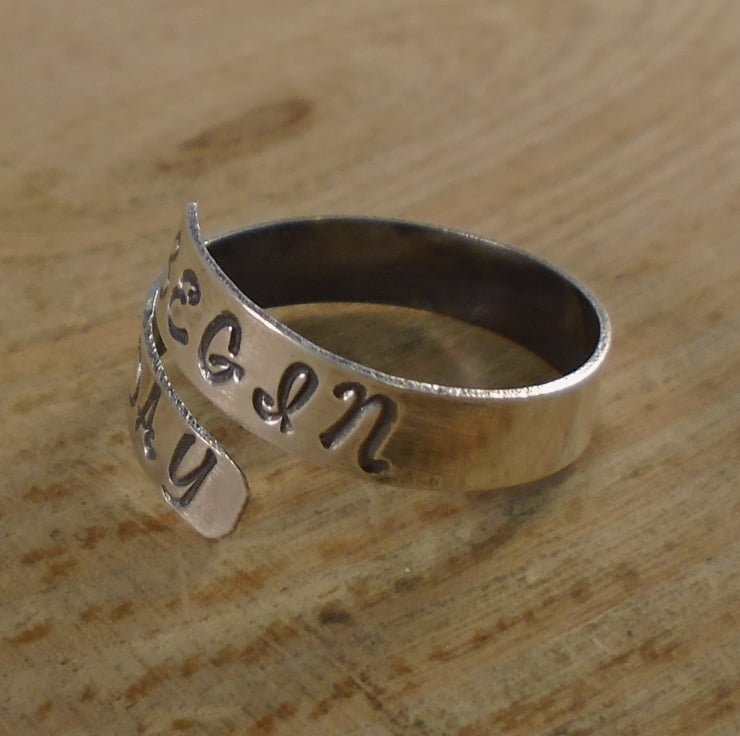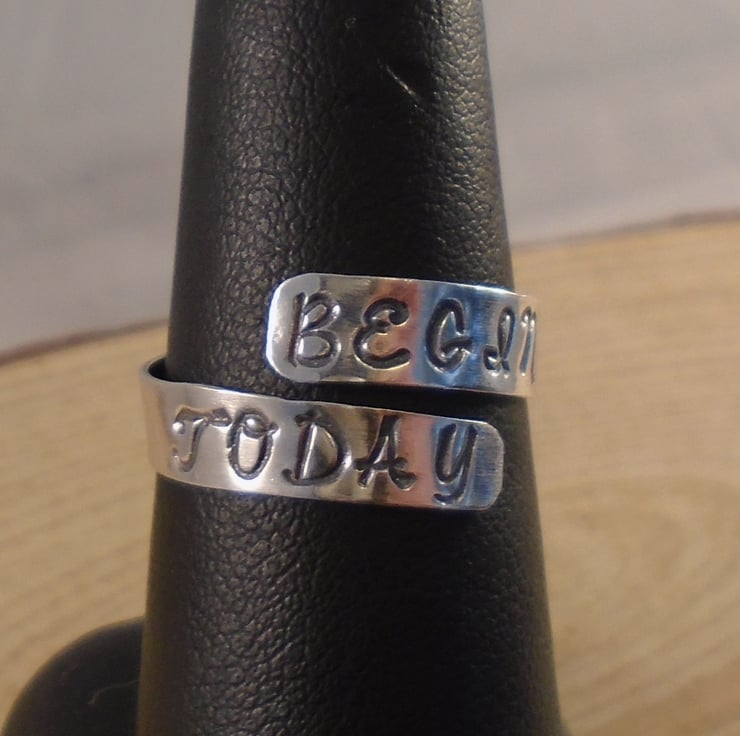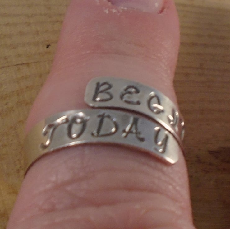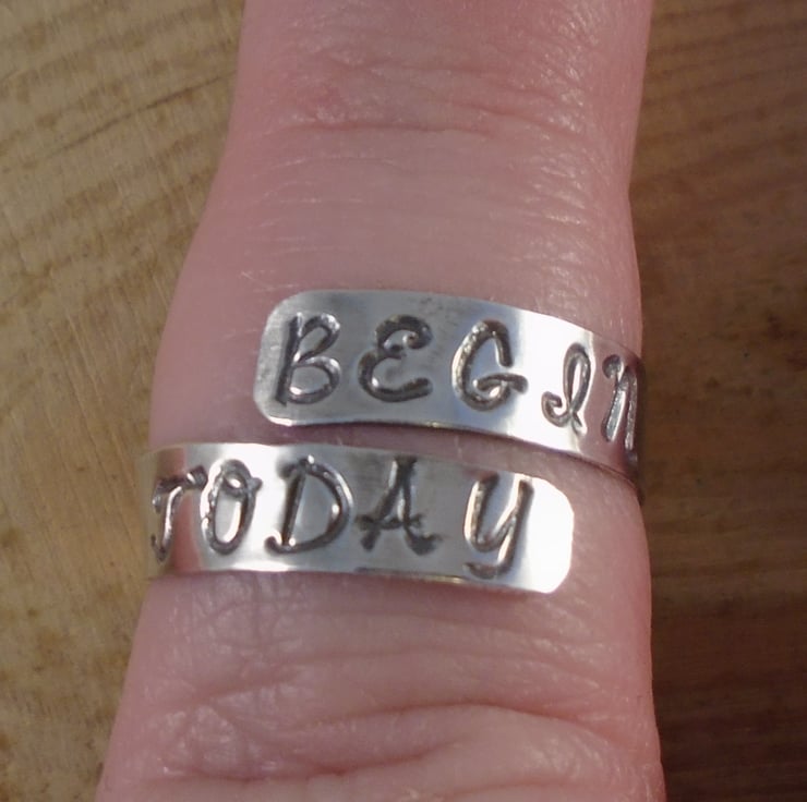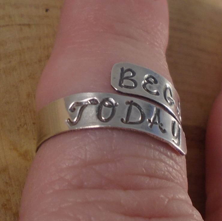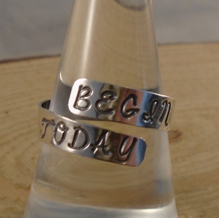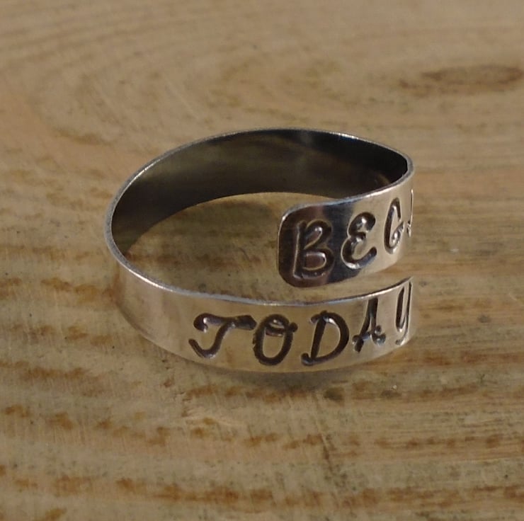A simple, inspirational ring, hand made from sterling silver. A strip of silver has been hand pierced from a sheet. It has then been hand stamped on either end with the words 'Begin Today.' The strip has then been bent around a mandrel to form a cross over, adjustable ring. The ring has then been oxidised to blacken the wording.