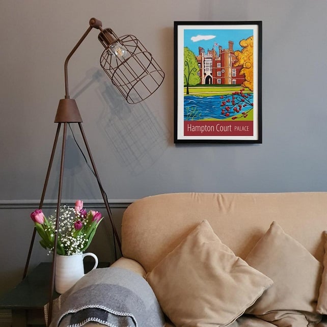 A contemporary travel poster style print of the view across the Thames to Hampton Court Palace, from my own original acrylic painting.