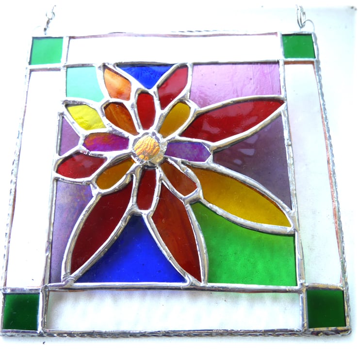 The centre of the flower is a rather gorgeous dichroic glass nugget fused in my kiln and I've framed my flower with prettily textured clear glass with green corners to the frame to complete the colour spectrum.