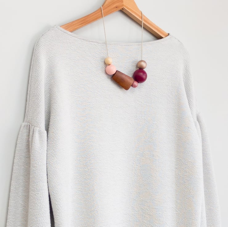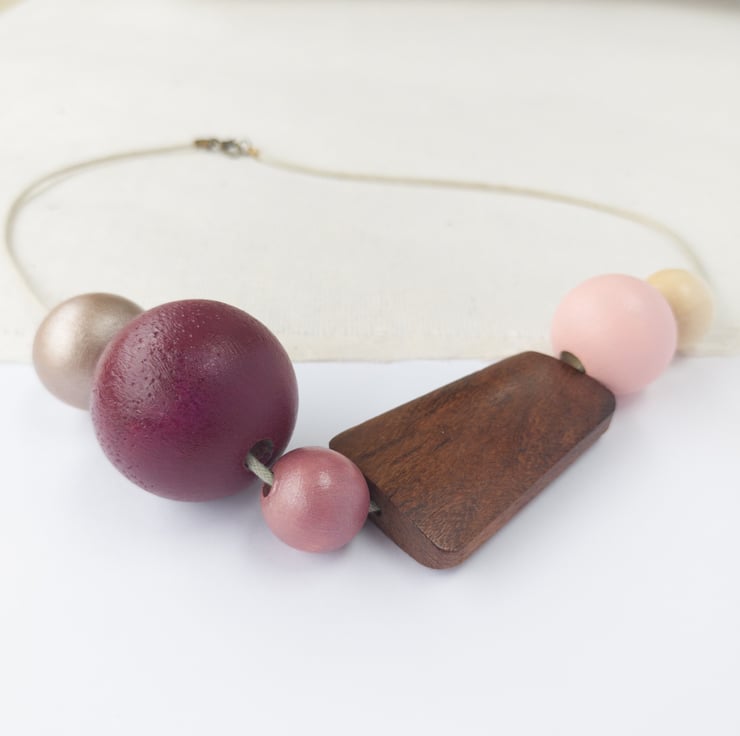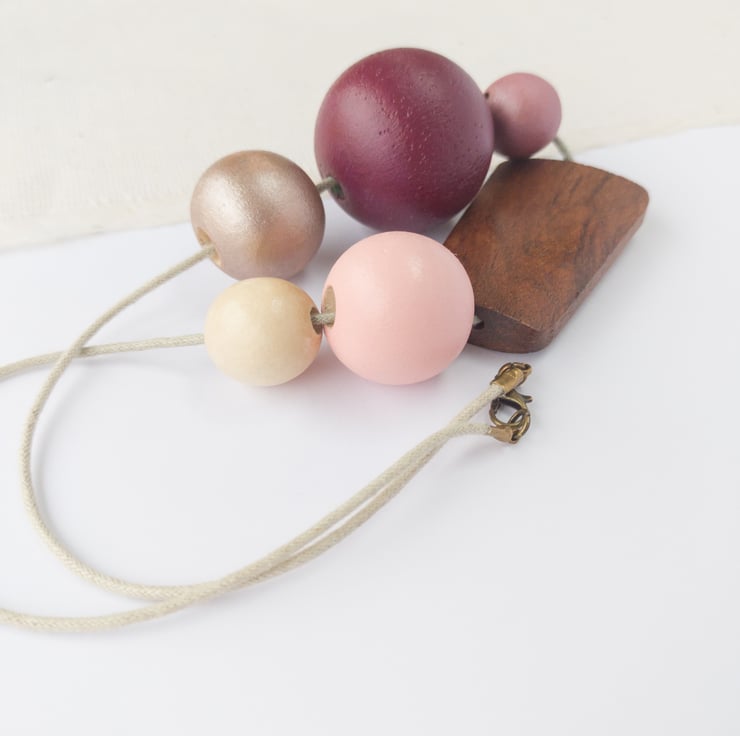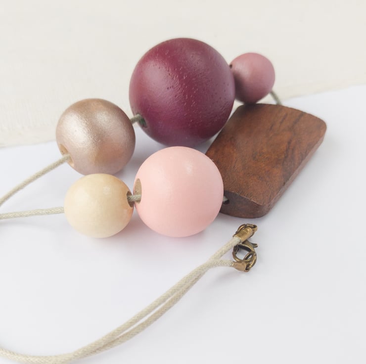 'Bubbles' is from the same series as 'Jemima' and 'Dotty'. The large flat wooden vintage bead sits well with the 5 round hand painted beads. The beads are all of different sizes in light pink, gold, plum, cream and heather. The necklace is fixed to one length and the antique bronze lobster clasp makes it easy to take on and off.