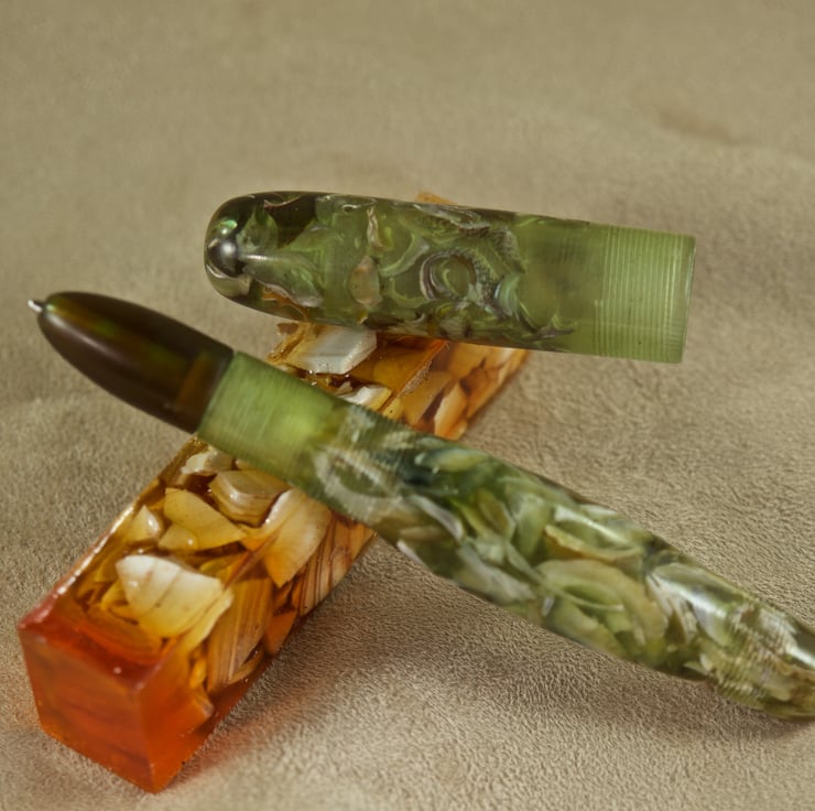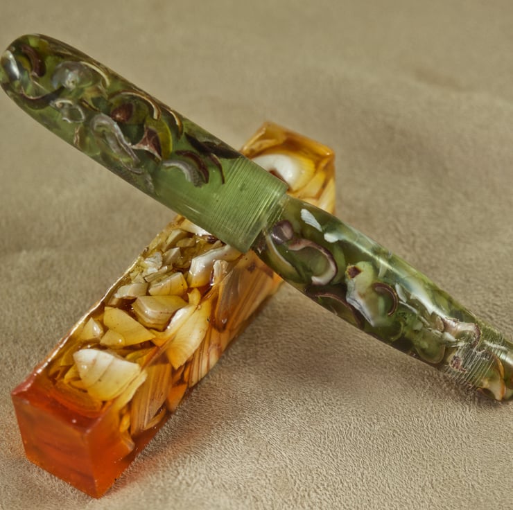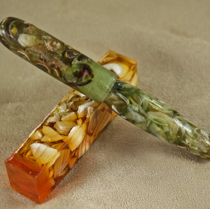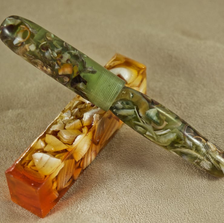 This very chunky pen is hand crafted with real limpet and periwinkle shells held within the lime green resin binder. This is a wide pen, perfect for anyone with a grip issue. The sea shells in this very special hand made ballpoint pen are from the beach that has formed behind Churchill Barrier No.4, between Burray and South Ronaldsay, Orkney. The lovely green colour is inspired by the early spring grass that grows on the sand dunes behind the beach, where Little Terns nest in the Orkney summer. The transparency of the colour allows light to refract through this unique pen, illuminating the seashells within. The body has a wide barrel with rounded ends and a long, broad rounded tip section. The cap has parallel sides and a rounded end, and is postable via the triple-lead thread allowing them to be separated quickly and easily. The pen uses a standard Parker refill and the tiny step up (0.25mm) from the section to the body makes this stunning pen very easy to write with. With the cap attached the pen is 138mm long and weighs 46g. With the cap removed for writing it is 124mm long, about 17mm at its’ widest and weighs 33g.