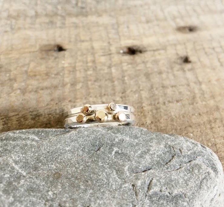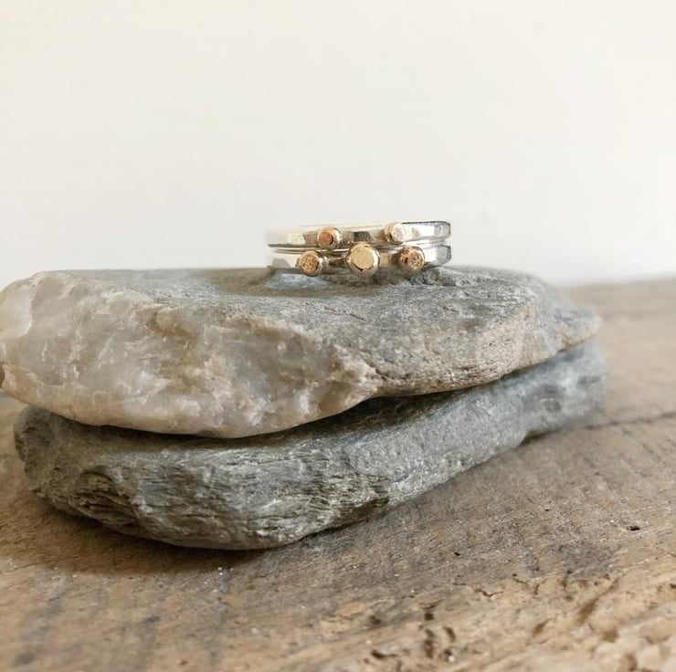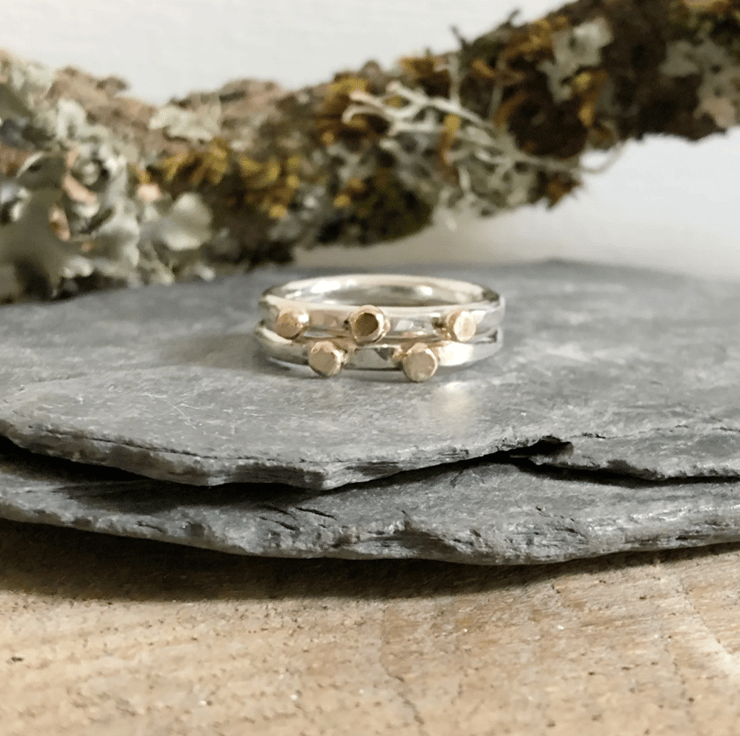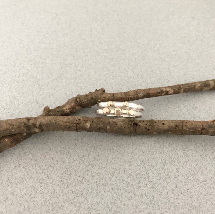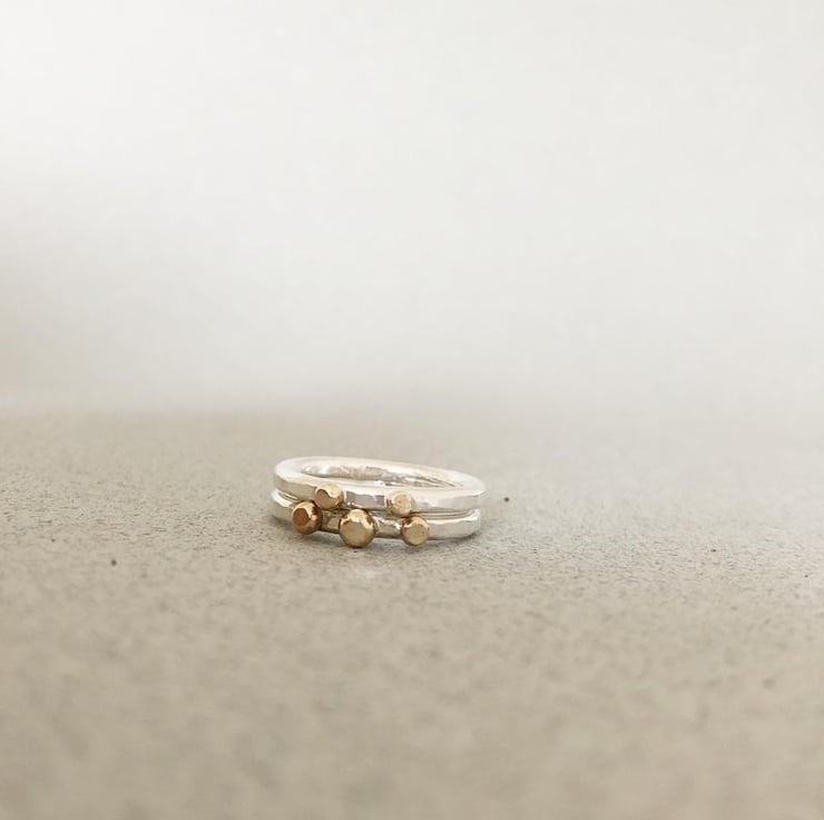 These stacking rings are so pretty and versatile that they will be a great addition to your jewellery collection. They are thick sterling silver rings with 9 ct. gold embellishments, and they can be worn together or with other stacking rings to make your own statement.