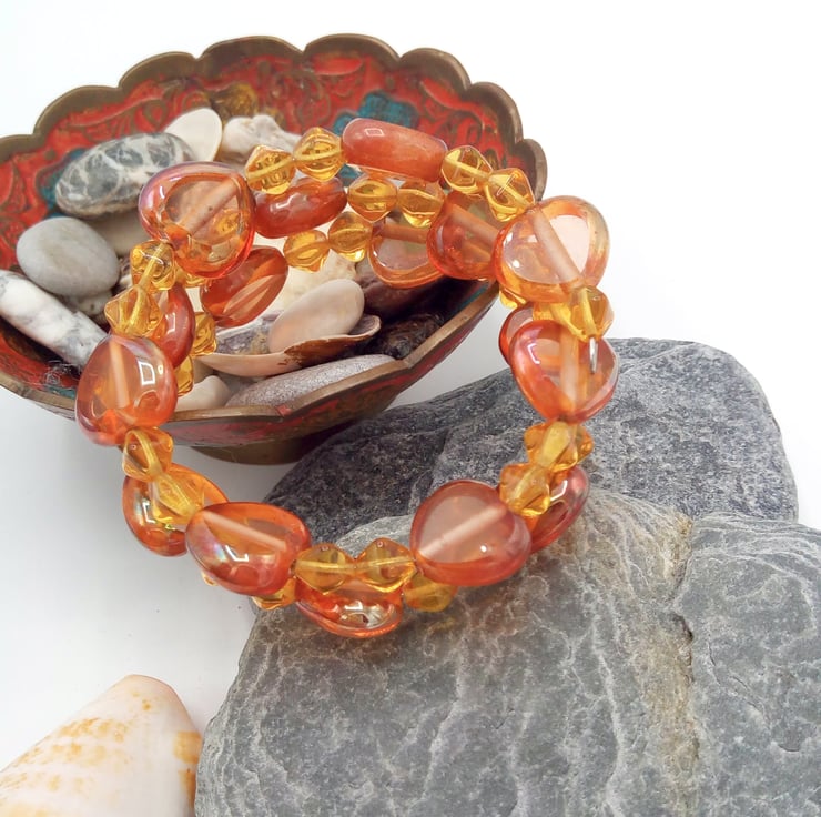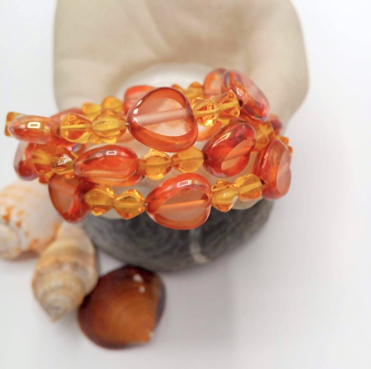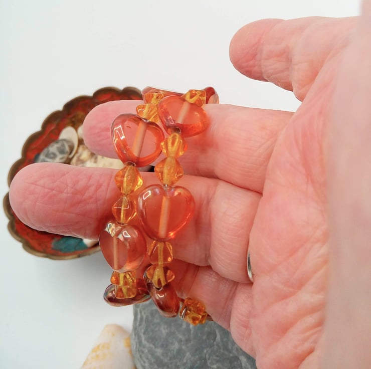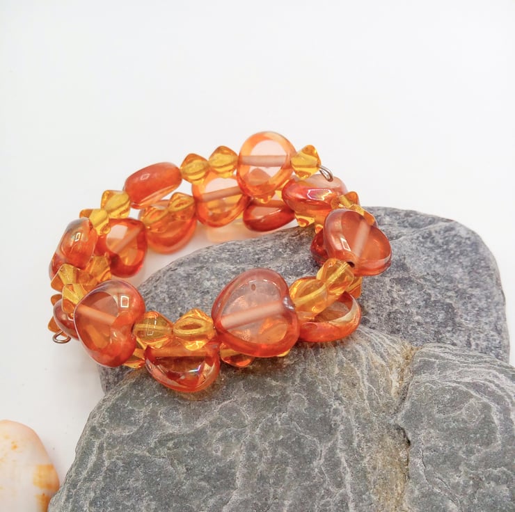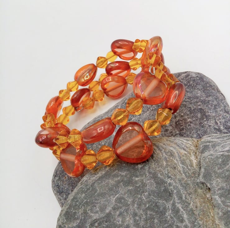 The cuff memory wire bracelet is made by threading 15mm x 12mm russet heart beads and 8mm x 6mm amber coloured bicone beads on to memory wire. When on the wrist it makes a lovely 2 strand bracelet which will comfortably fit a wrist 16 - 17 cm in circumference.