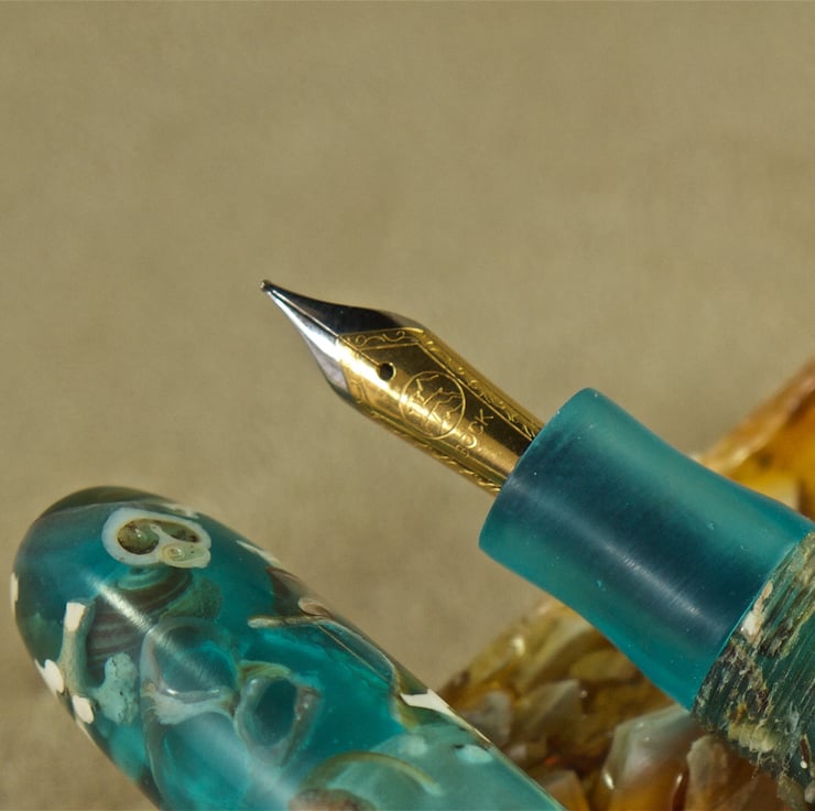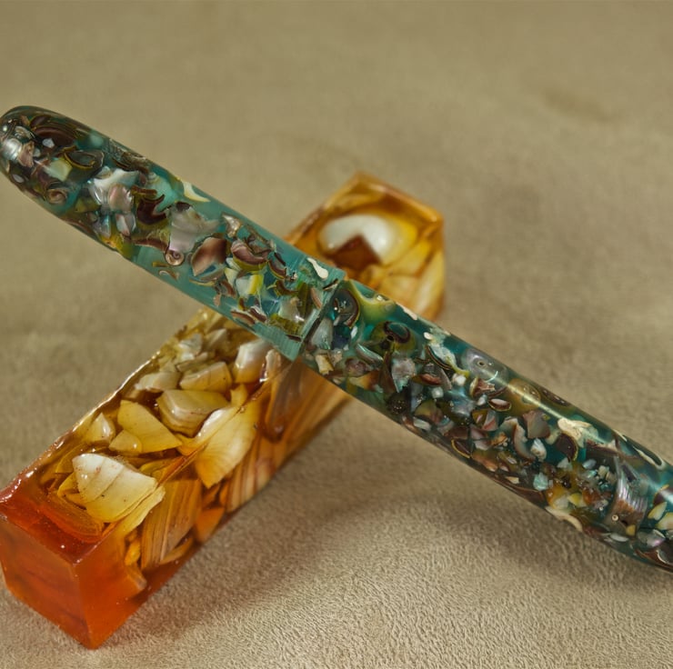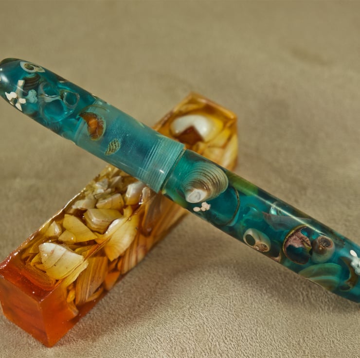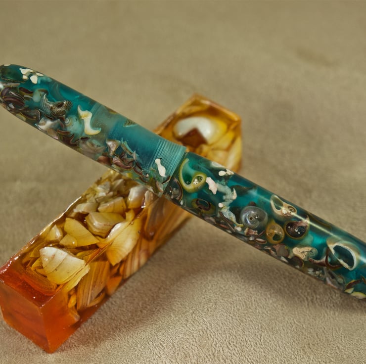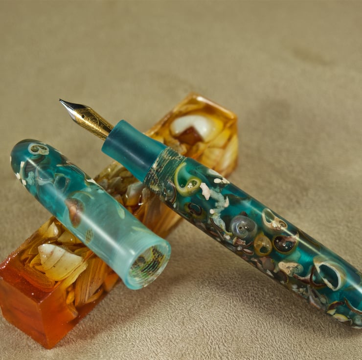 This beautiful collectors fountain pen has small clam and winkle seashells held within the light blue resin binder. Made on Orkney, I collected these shells from Newark Bay, South Ronaldsay, and the transparent blue tint is inspired by the azure summer sea around our beautiful islands. It allows light to refract through this collectors pen illuminating the seashells within, making them seem to float in the water. The pen has a parallel shape to the body and cap with rounded ends, and the cap has a gentle flaring at the mouth. The triple-lead thread connecting the cap to the body allows them to be separated quickly and easily. The hand-made nib section contains a German made Bock No.5 medium nib connected to a Beaufort Inks converter to hold the ink. The tiny step up (0.5mm) from the section to the body makes this stunning pen very easy to write with. The pen is 140mm with the cap attached. It is 121mm long with the cap removed for writing, about 17mm wide and weighs 28g. These unique artisan pens take around 9 hours to create, and are perfect for wedding gifts and favours.