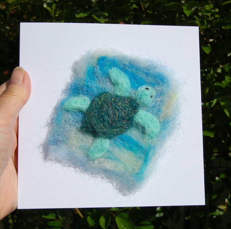 The turtle has been needlefelted onto a piece of commercial felt and lightly attached to the card with glue dots making it easy to remove for framing. The fibre I have used for the turtle shell has sparkly strands running through, catching the light when moved.
