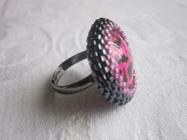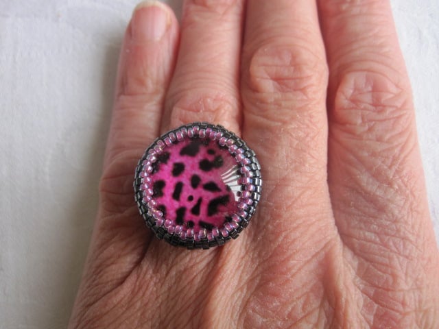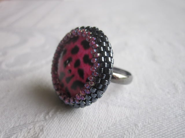 A pink and black animal print themed beaded ring. It is made with Japanese seed and delica beads, a glass cabochon and black tone adjustable ring base. The beadwork itself measures approx. 2.3cm in diameter and the adjustable ring base has an inside diameter of approx. 1.7cm. This ring will come in a little gift/storage box/case as shown in the photo's.