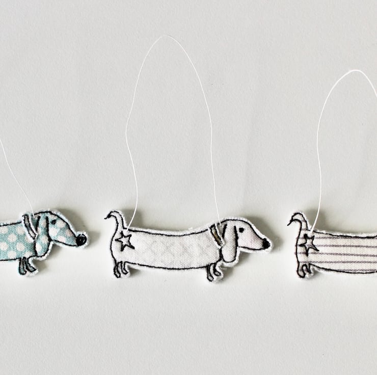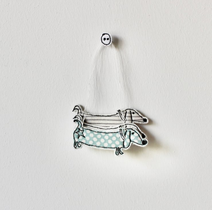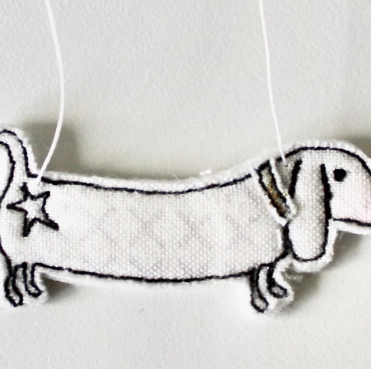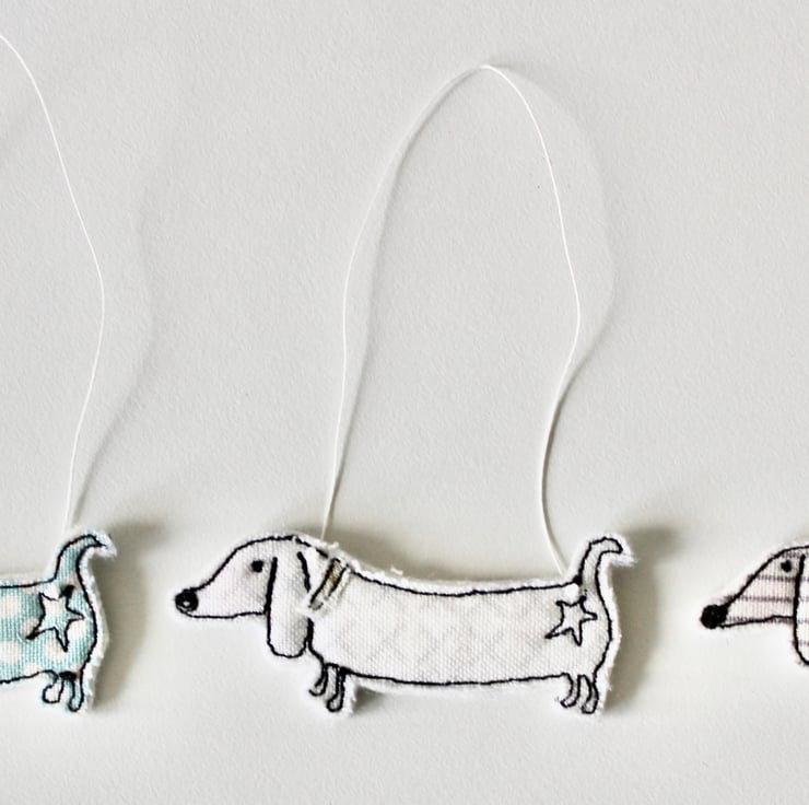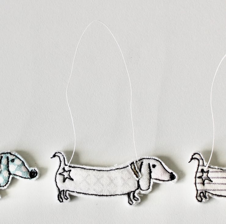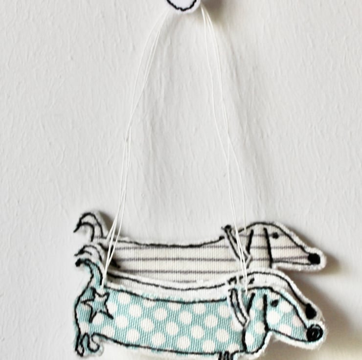 Dachshunds are sewn using cotton cloth, 100% wool felt and free hand machine embroidery; multiple layers of cloth are sewn together and cut out by hand using sharp scissors. With linen strings to suspend.