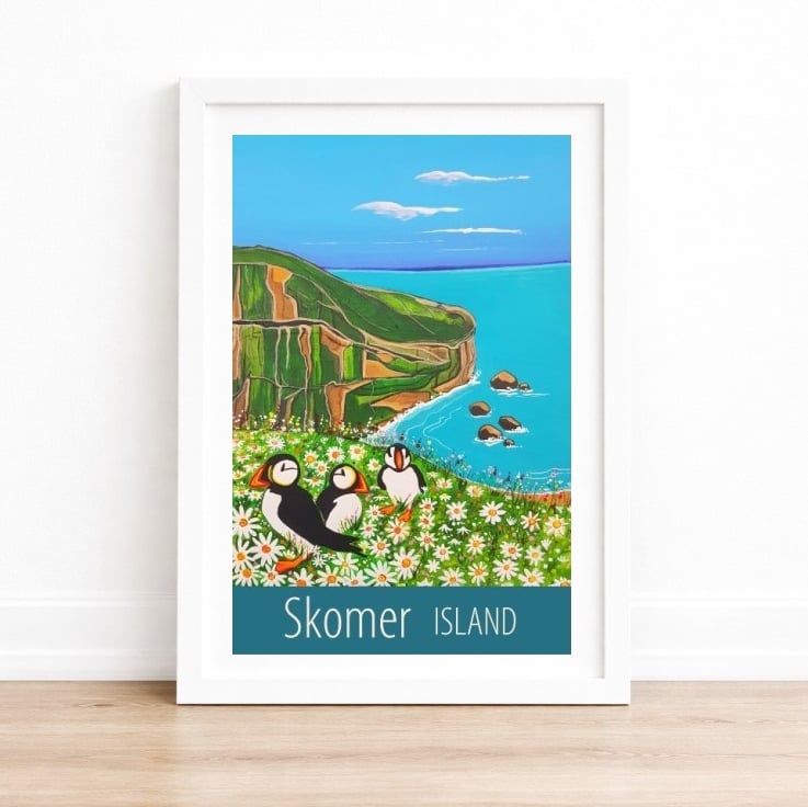 A beautiful print of the puffins of Skomer Island, off the coast, Pembrokeshire, from my own original acrylic painting. A perfect gift for those who love puffins!
