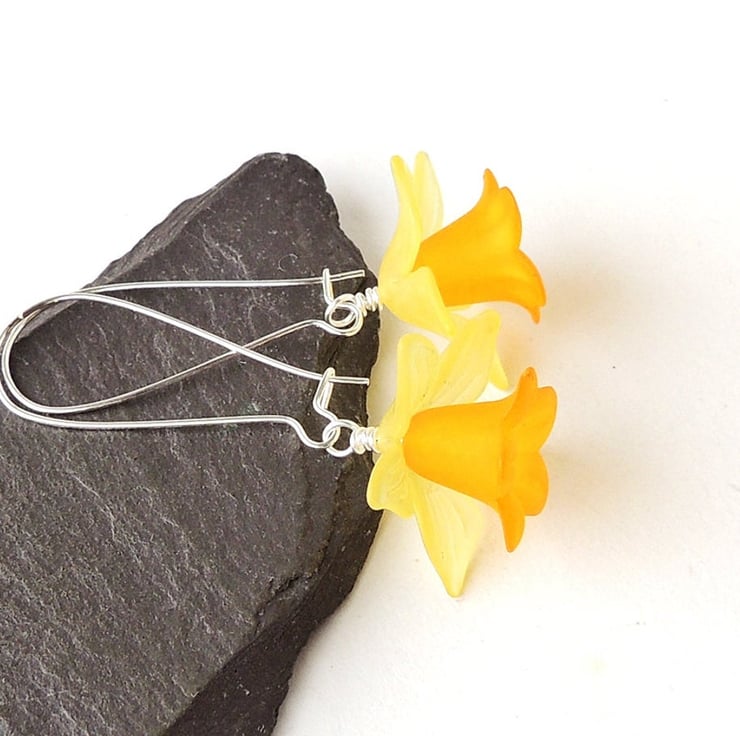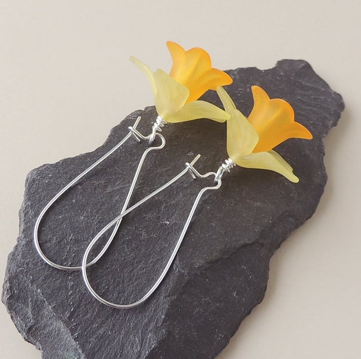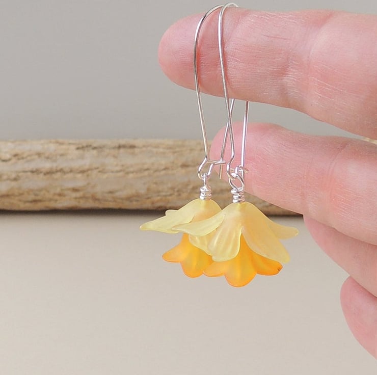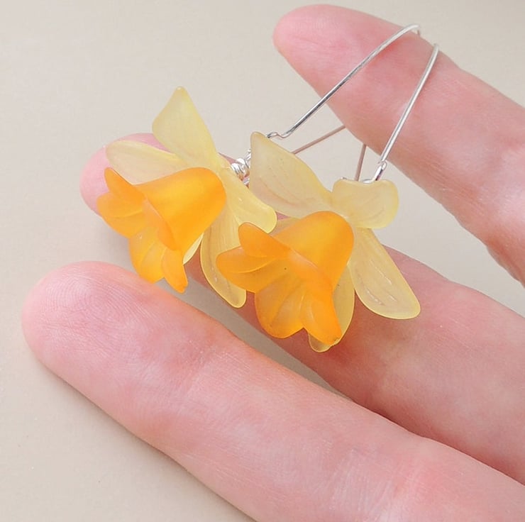 These daffodil earrings have yellow and orange lucite flowers on long silver plated kidney or safety ear wires.