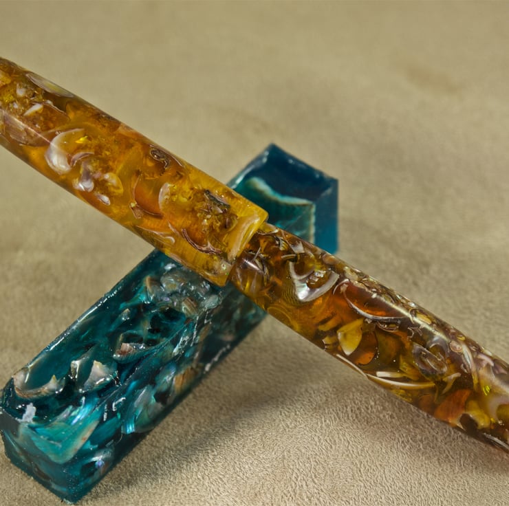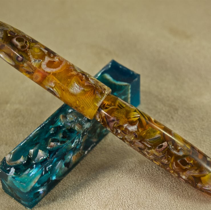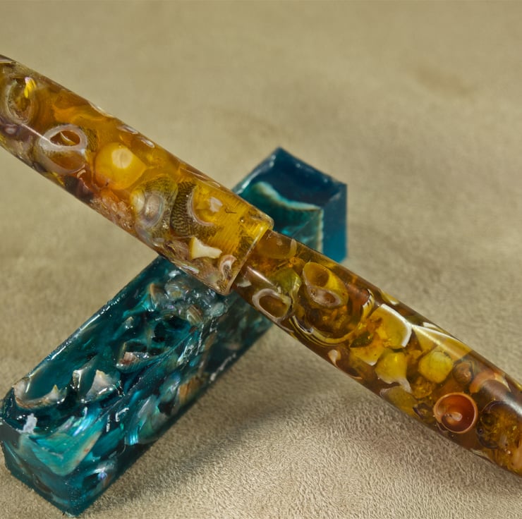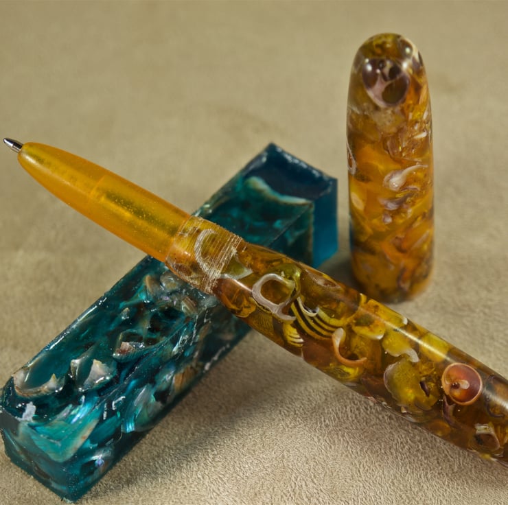 This unique hand crafted collectors pen has natural periwinkle shells held within the deep amber resin binder, all from the Sands of Wright, South Ronaldsay, Orkney. The beautiful amber colour within this ballpoint pen is inspired by the early light of spring sunrise as it illuminates the sand on the beach, and the grass on the hill on Hoxa. Like dawns first light, the transparency of the colour allows light to shine through the pen, clearly showing the shape and texture of the seashells within. A true collectors pen, the cap has parallel sides and a rounded end with a radius to the edge of the mouth, while the body has a gentle taper from the tip section so the shape flows smoothly through the pen. A rounded end and a long, slender taper to the tip section makes this stunning artisan pen very easy to write with. The triple-lead thread allows cap and body to be separated quickly and easily. This is quite a long pen at 160mm with the cap attached. It is 143mm long with the cap removed for writing, about 18mm at its’ widest and weighs 40g. The pen uses a standard Parker refill.