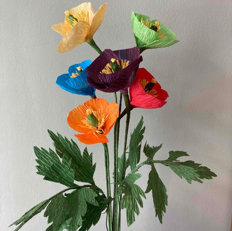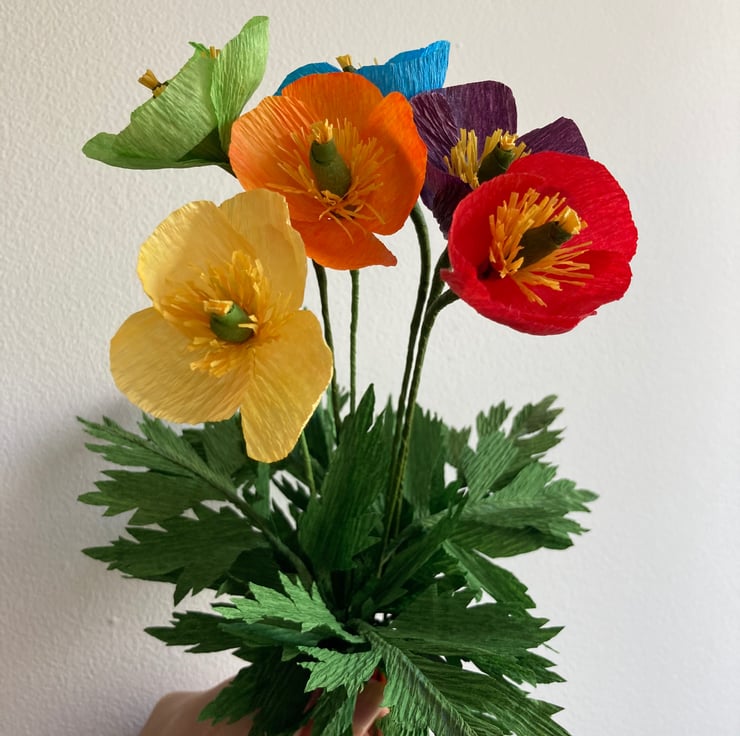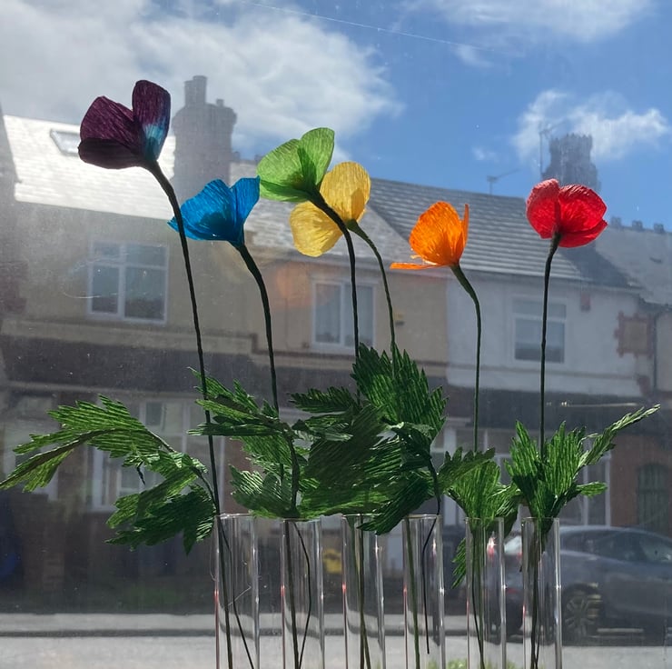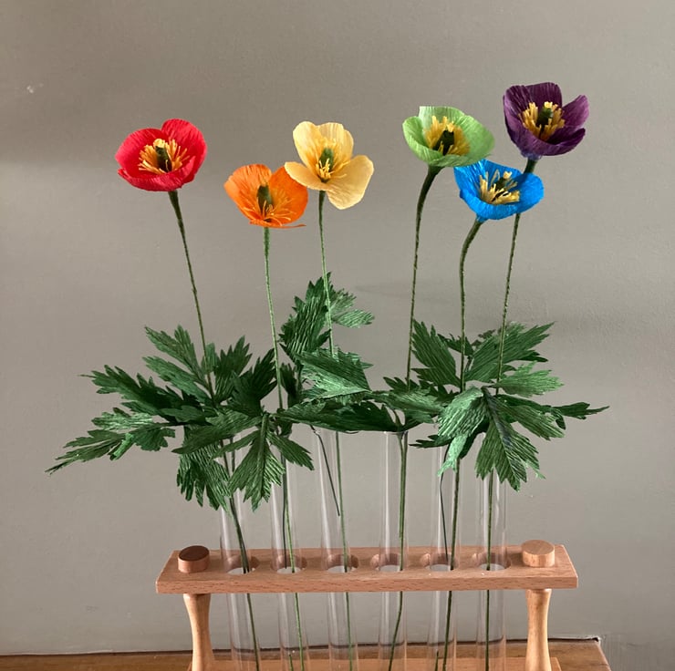 Handmade crepe paper poppies in a rainbow of colours. Look great arranged in a line or as a bunch! Includes all 6 poppies (red, yellow, orange, green, blue and purple) and two fluffy leaves. Please note the test-tube rack is not included.
