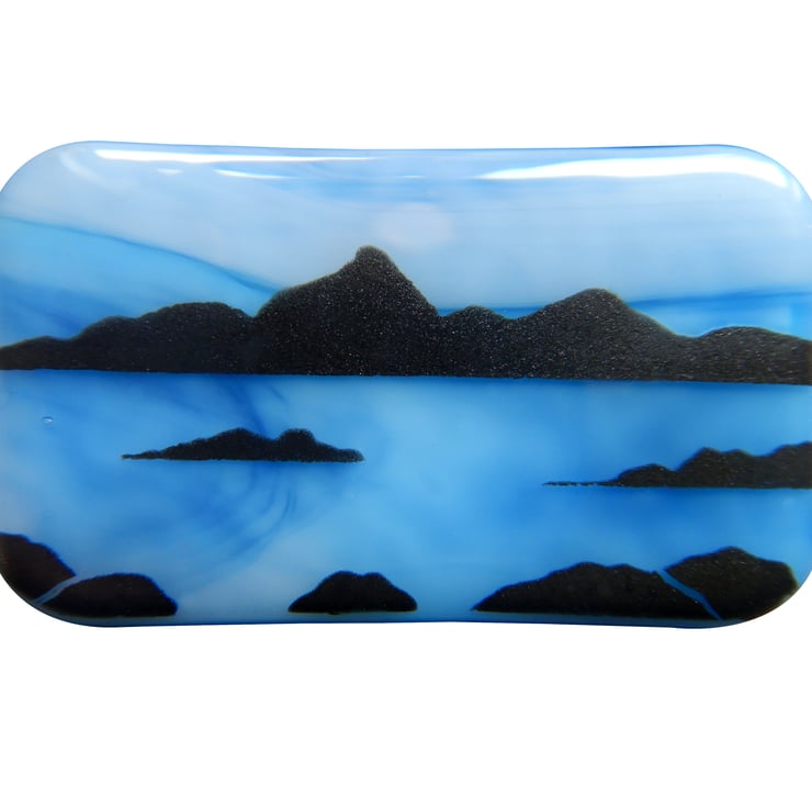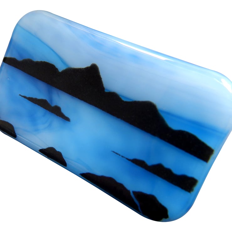 UNIQUE: Handmade Fused Glass 'ISLE OF ARRAN' Brooch. This brooch has been very carefully hand painted onto the surface of the wispy blue glass backing. No paint has been used but instead it is very finely ground fusing glass mixed with water. At this stage the blending of colours and adding of details was possible. The brooch was then fired in my kiln and the powdered glass and background fuse to become one piece.