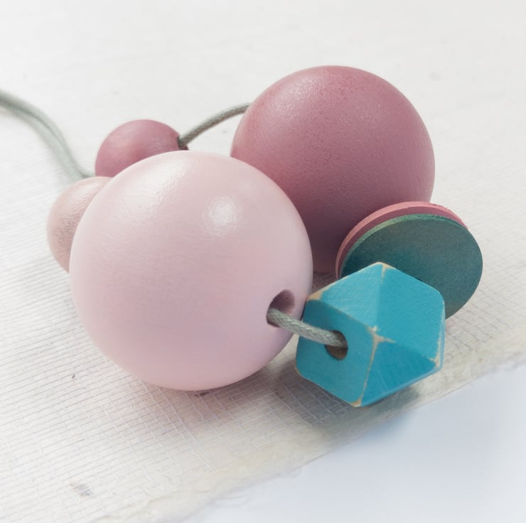 'Greta' is a chunky necklace made up of 7 wooden beads, the two repurposed flat 'button' beads were the starting point for the design. Candy pink, light pink and mauve with a shock of cyan and blue-green.