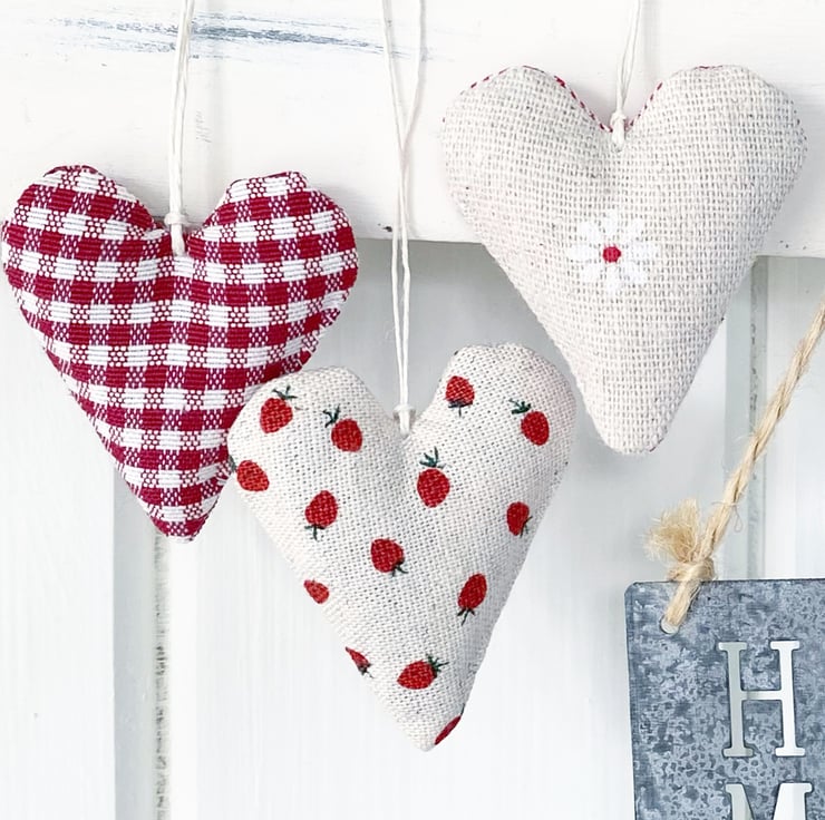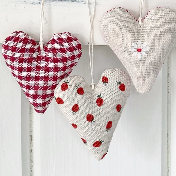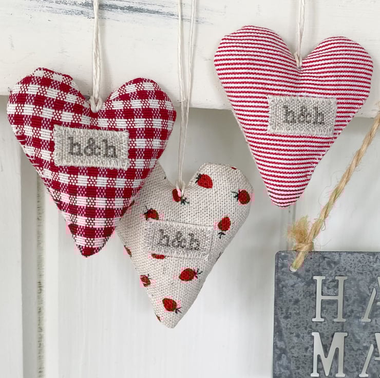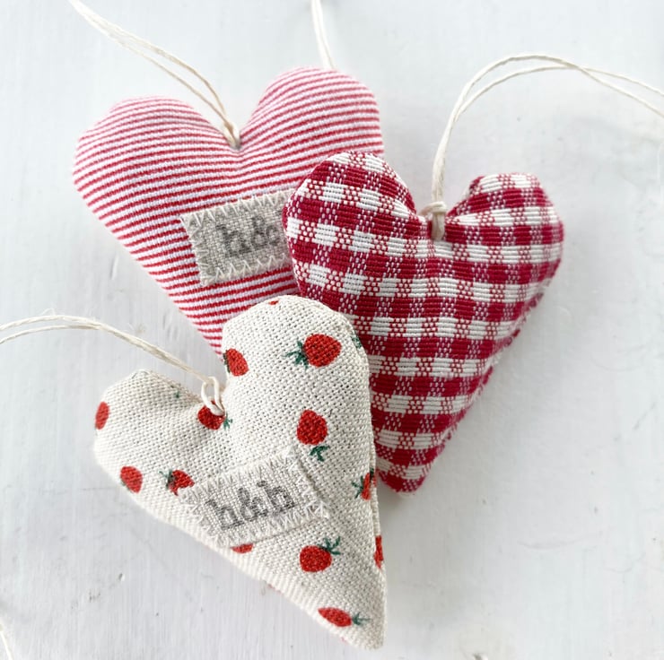 Super cute mini hearts in red and creamy-white linen-look cotton, featuring delicious strawberries, the sweetest daisy and berry-red tiny gingham checks. Handmade in my Hampshire garden studio, all three hearts are filled with locally grown fragrant lavender and are finished with a natural hemp twine hanging loop and a linen 'h&h' label.