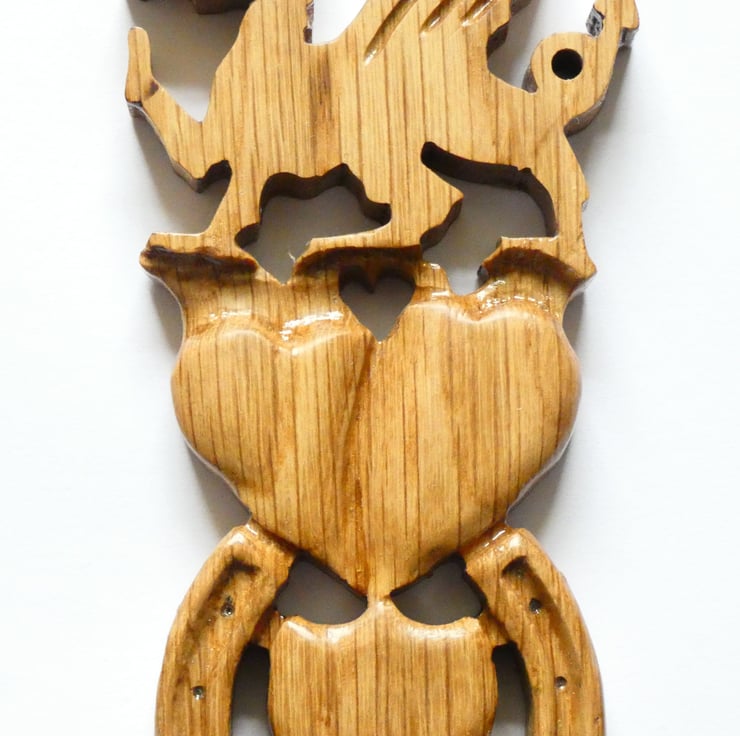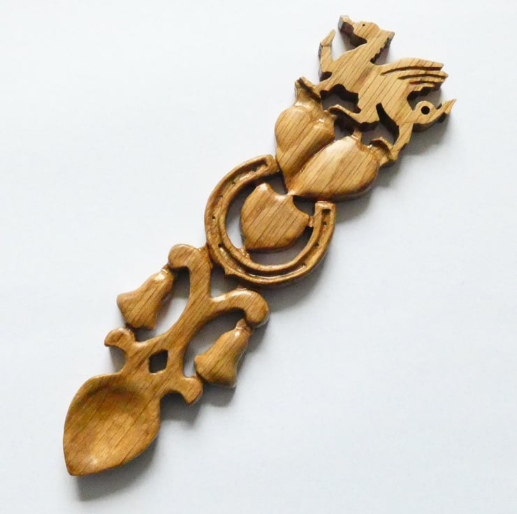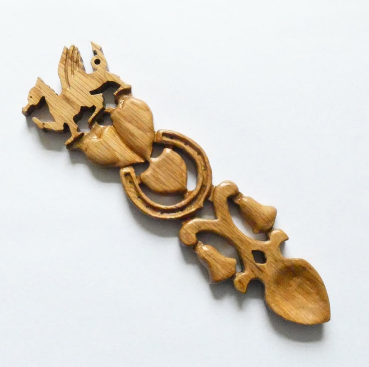Unique Welsh Dragon Love Spoon made from a solid piece of Oak. This handcarved Lovespoon also contains hearts, a shield, a horse shoe, and two bells. It has been upcycled from reclaimed wood. A perfect present for an anniversary, birthday, wedding or engagement.