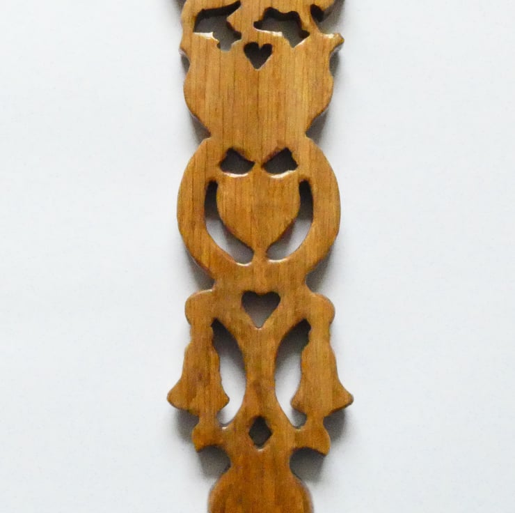 The love spoon is approximately 23 cms long, approximately 6.5 cms at its widest point and approximately 1 cm in depth.