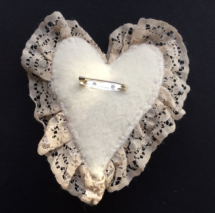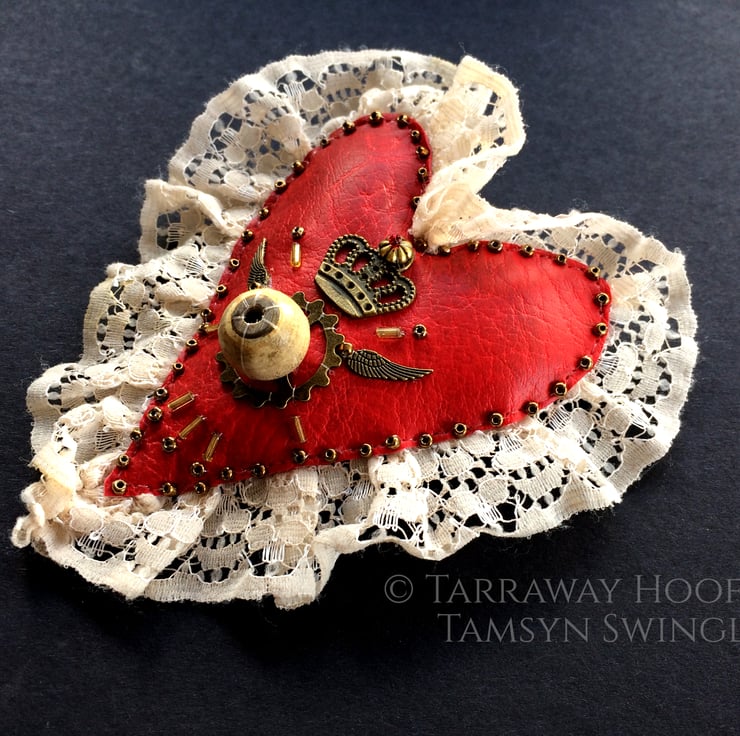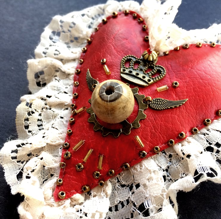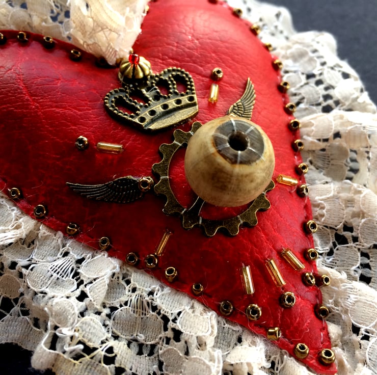 Measuring 11.5 cm x 12.5 cm x 3.5 cm, including lace trim, this brooch has upcycled plastic at its core, making it sturdy, backed in fleece to add a feel of comfort. The front is a design I made years ago and have incorporated into prints. It is an All Seeing bone eye, with charm wings, cogs and crown, decorated with gold coloured bugle beads and seed beads. The heart is made out of a faux leather, It attaches by a bar pin on the back.