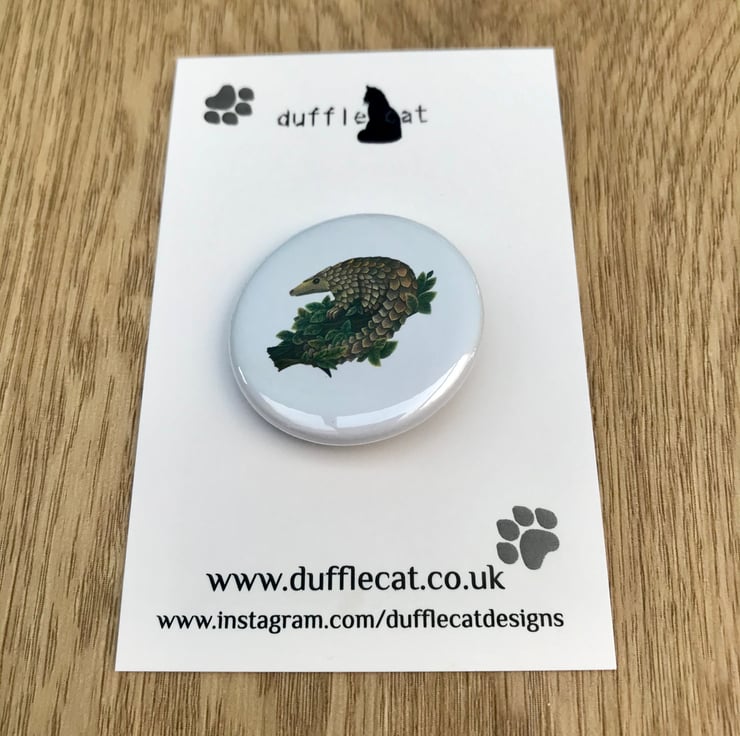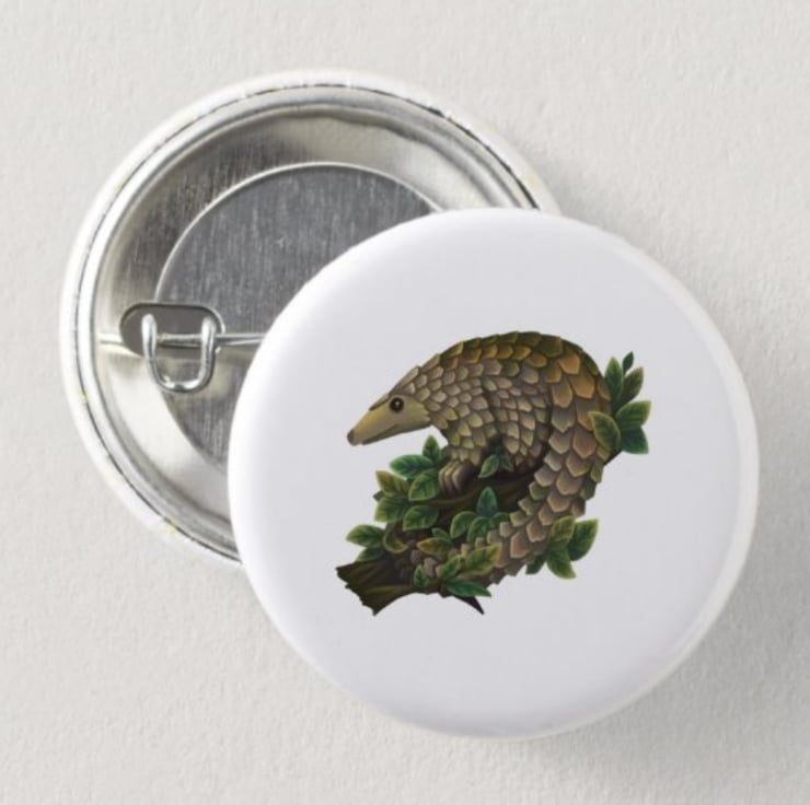 A pangolin badge. Standard, 3cm (1.25") round badge, Covered with scratch and UV-resistant Mylar. Metal and plastic. With a steel pin back.