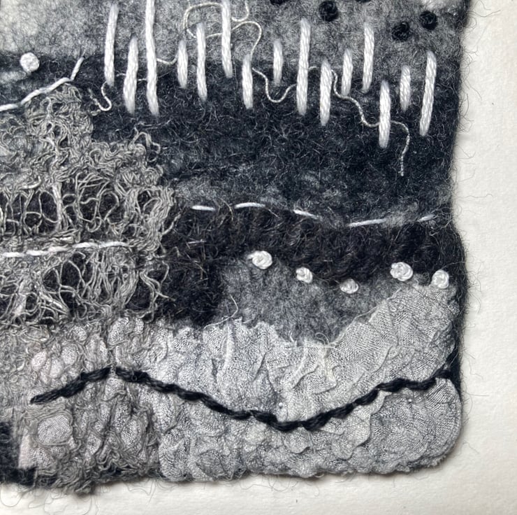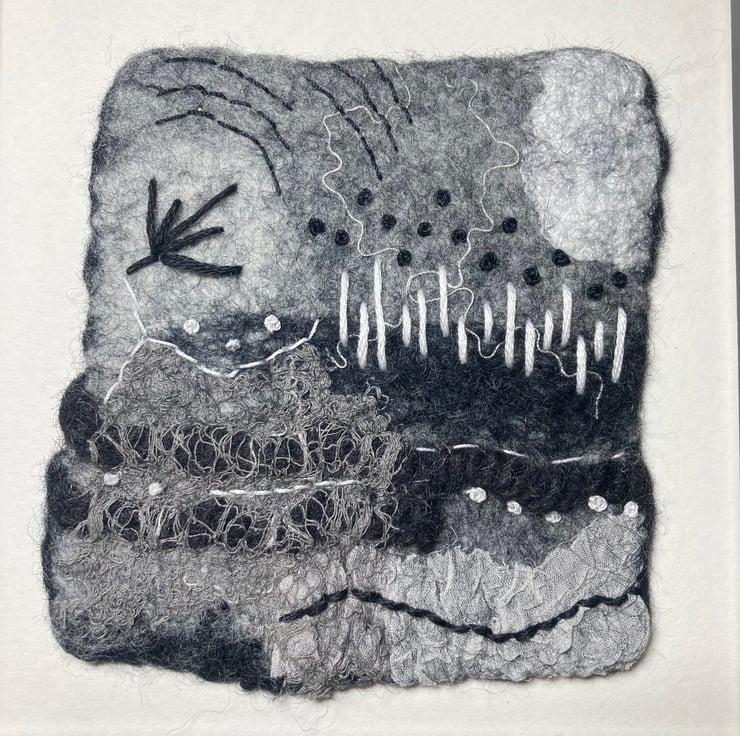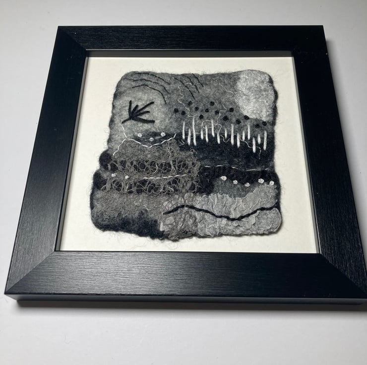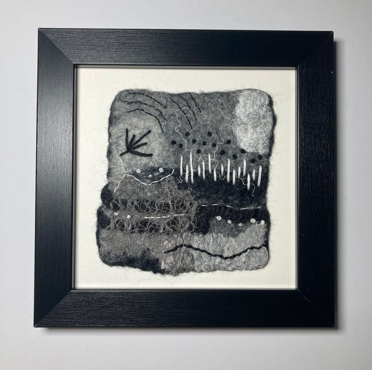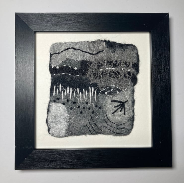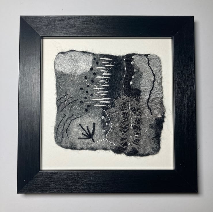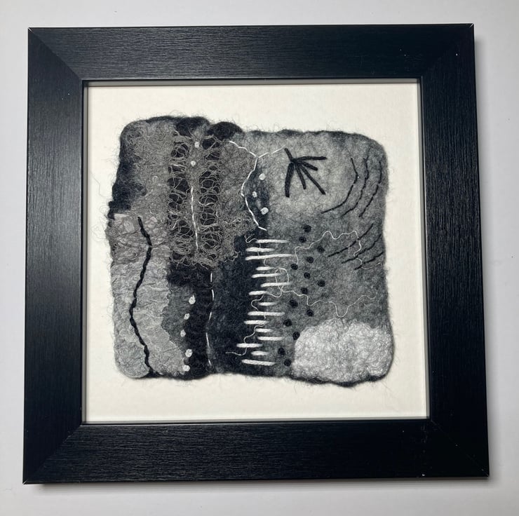 One of a series of monochrome abstracts, this picture has been hand felted. It has been made from a base of merino wool fibres with various natural and synthetic fibres and fabrics added to the surface to provide texture and detail. Further detail has been added using hand stitching in black and white threads. This picture can be hung in any orientation (see photos) and is open to lots of interpretation - the choice is yours.