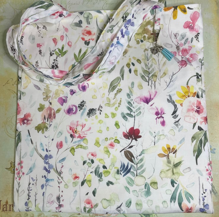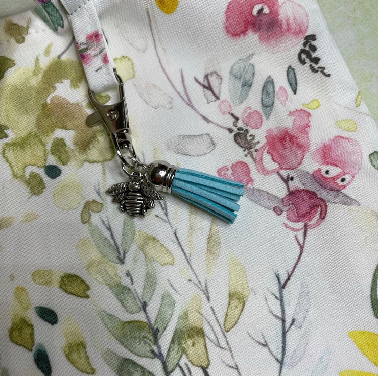 Pretty meadow print designer fabric from Spoonflower, lined with cream cotton. Mid length handles and a bee charm with turquoise tassel.