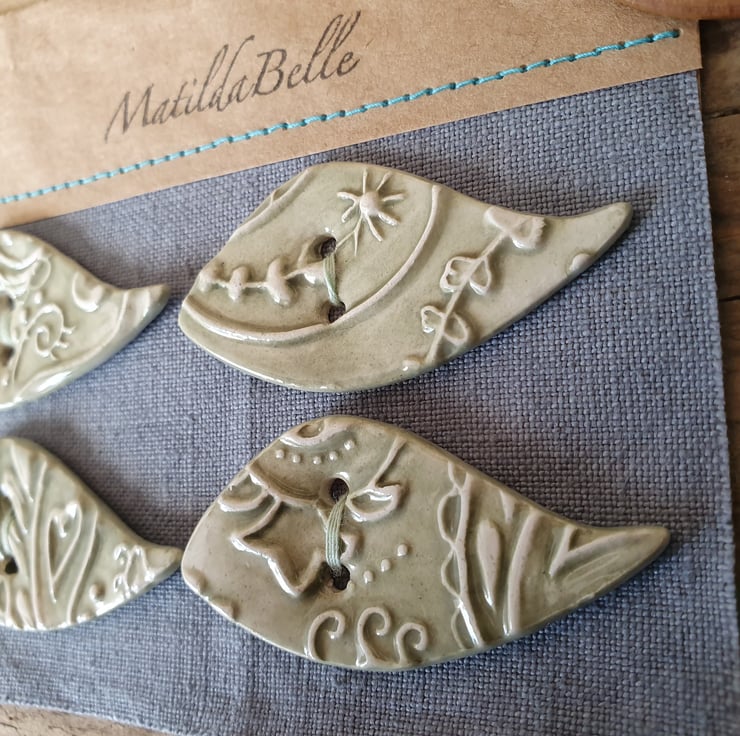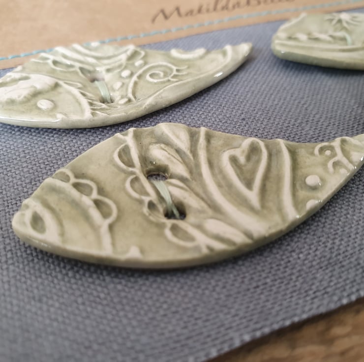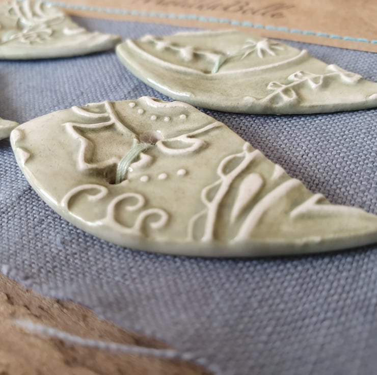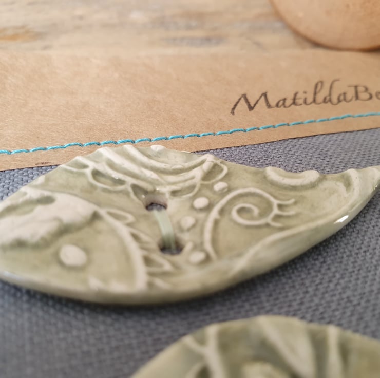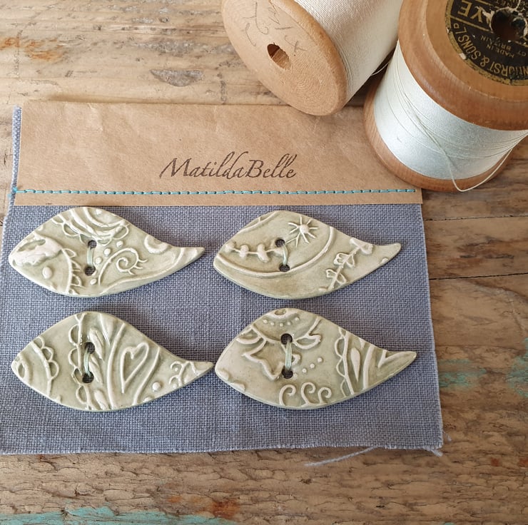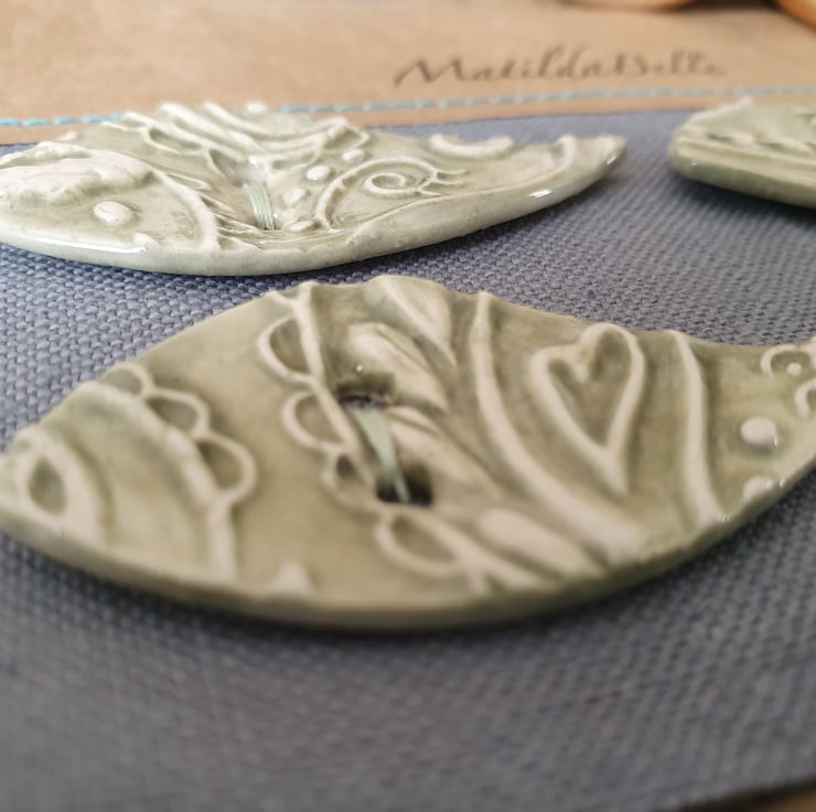 Set of Four Handmade Ceramic Buttons imprinted with a unique MatildaBelle Paisley Pattern. Glazed in Soft Green on both sides and stamped with the MB makers mark on the reverse .