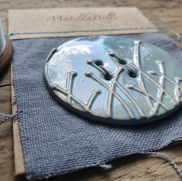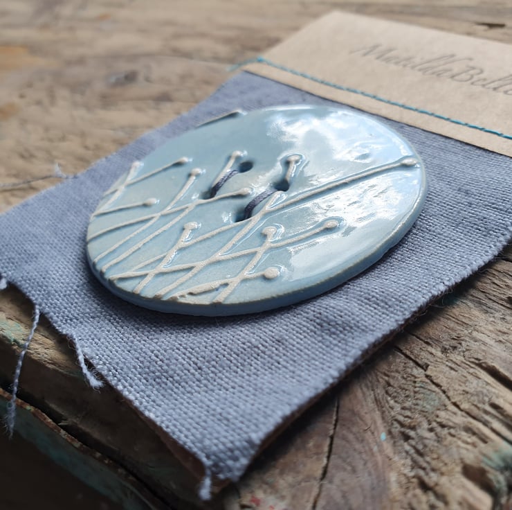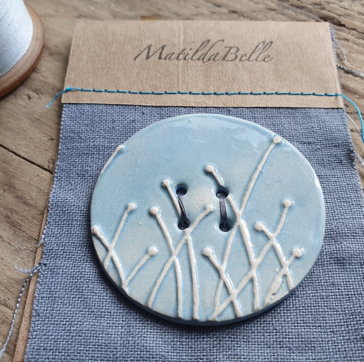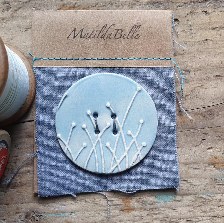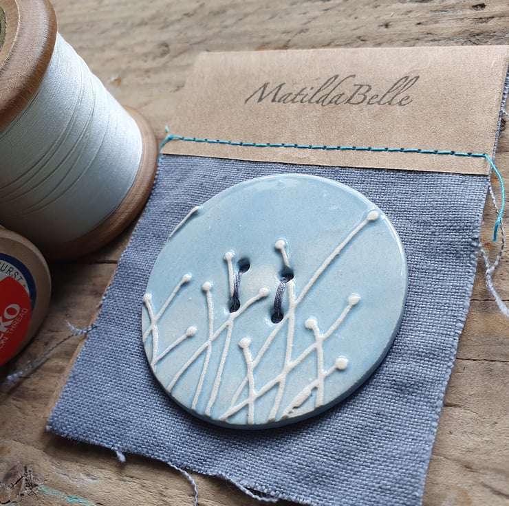 Handmade Ceramic Round Statement Button glazed on the front in Soft Blue and imprinted with an original MatildaBelle Seed Head design. The rear of the button has been left unglazed and stamped with the MatildaBelle makers mark.
