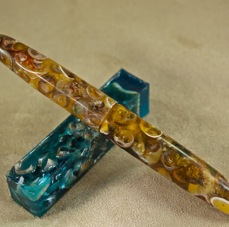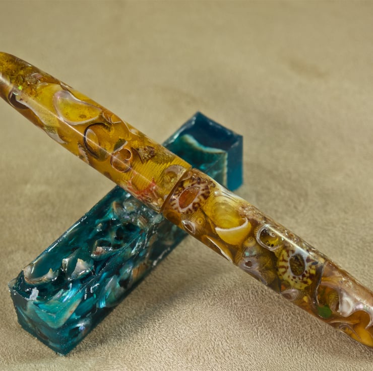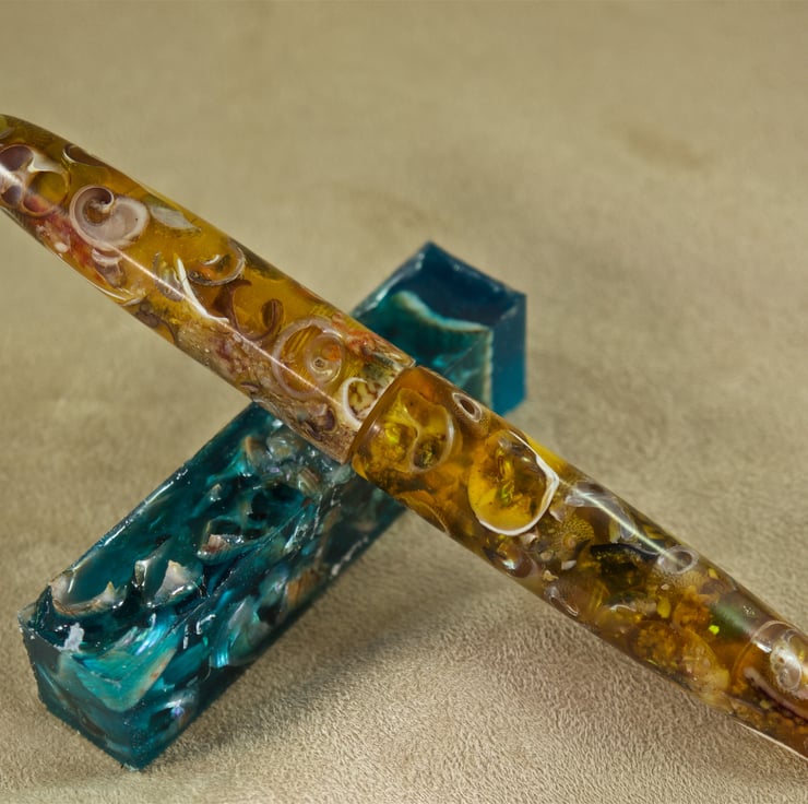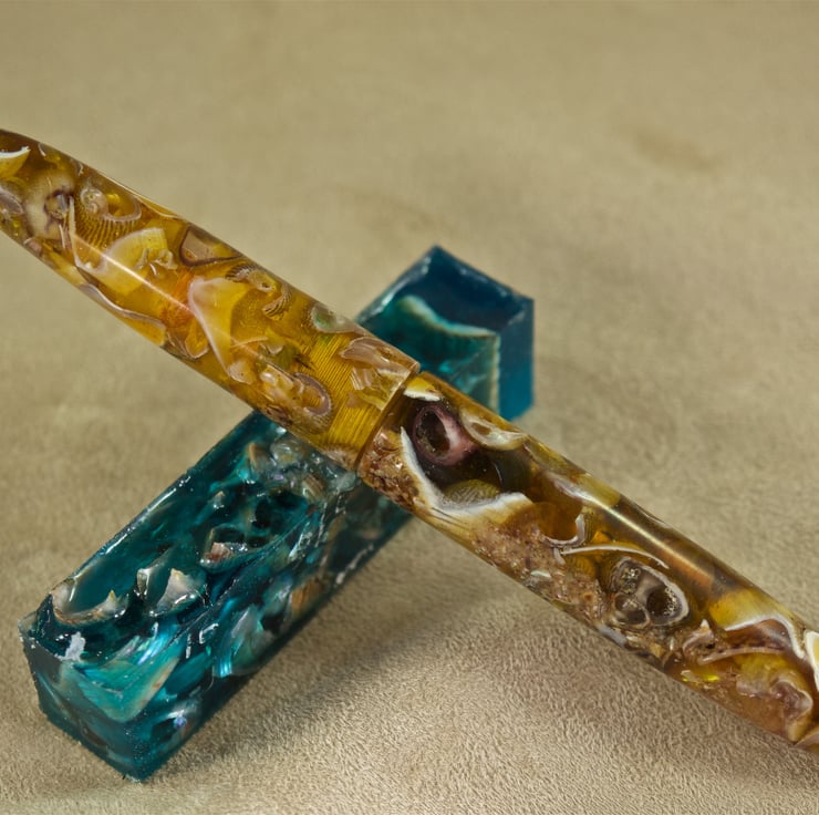 This beautiful artisan collectors pen is hand crafted from real sea shells in Orkney. Every part of the pen except the refill is crafted entirely by hand, and has periwinkle and clam sea shells held within the amber coloured resin binder. These Orkney seashells came from the beach that has formed behind Churchill Barrier No.4, between Burray and South Ronaldsay, so with this pen in your pocket you will forever have a small piece of Orkney with you. The colour of the resin resembles amber (fossilised tree resin), and allows light to refract through the pen, illuminating the seashells within the pen. The cigar-shaped pen has a wide parallel body along 2/3rds of its' length, then tapers down to the rounded end, the yellow coloured tip section also has parallel sides and a gentle curve to the point. The cap is parallel for half its' length, then a gentle taper down to a rounded end. The triple-lead thread allows cap and body to be separated quickly and easily. The pen uses a standard Parker refill and the 2mm step up from the cap thread to the body makes this stunning pen very easy to write with. The pen is quite long at 166mm with the cap attached. With the cap removed for writing it is 142mm, about 20mm at its’ widest and weighs 39g.