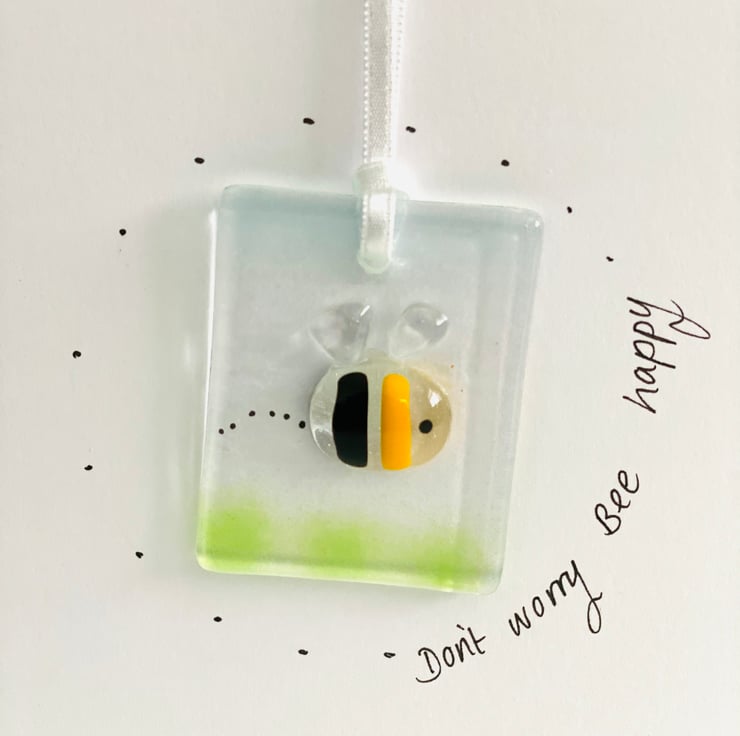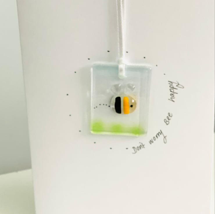 A pretty fused glass bee hanging keepsake card. A gift and a card in one . Perfect little card to cheer someone up. Card is 5 in x7 in with detachable glass hanging decoration .