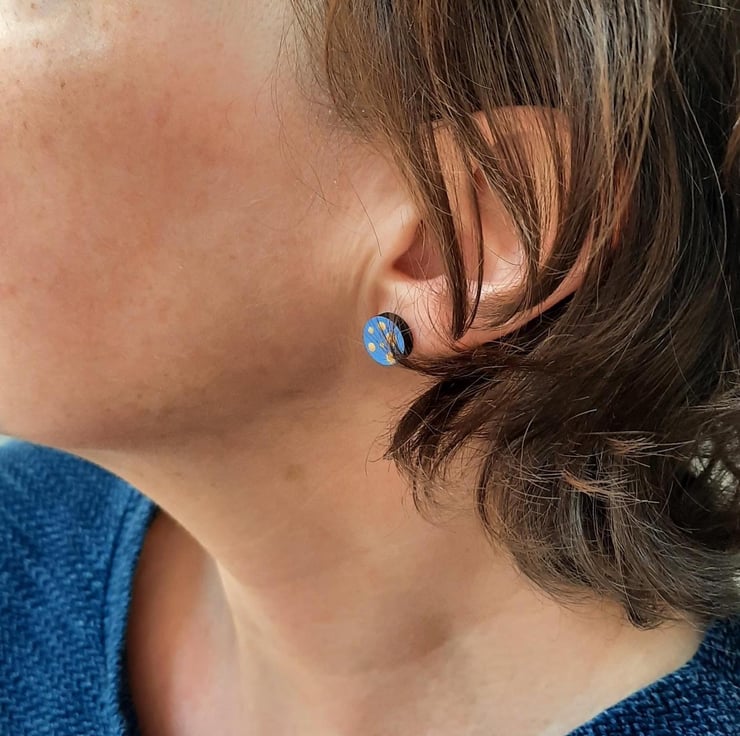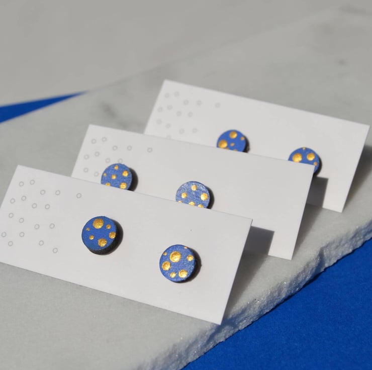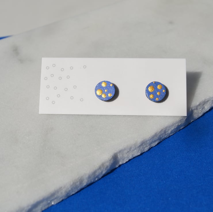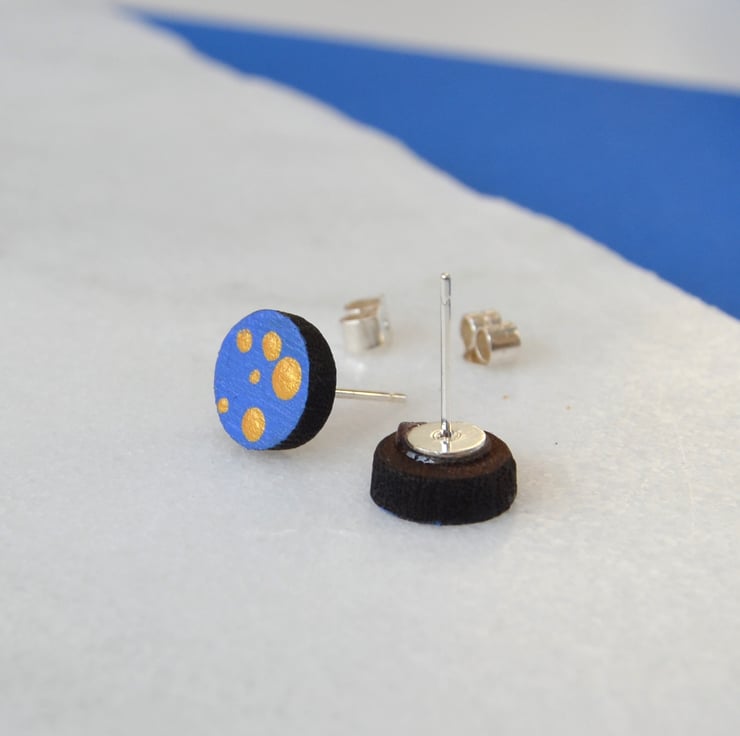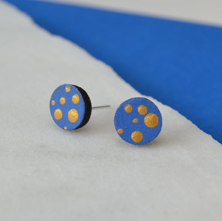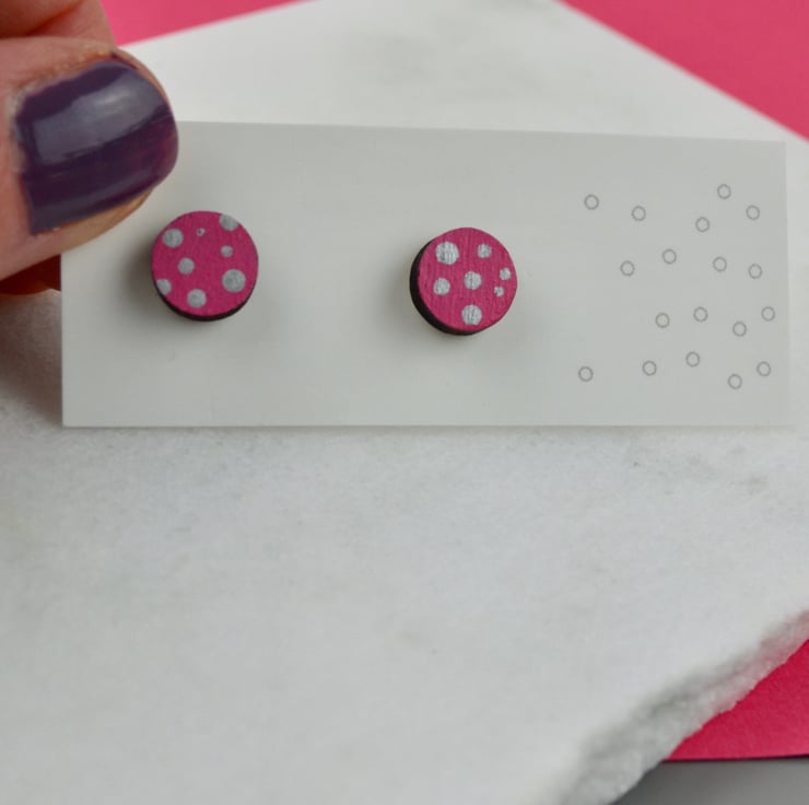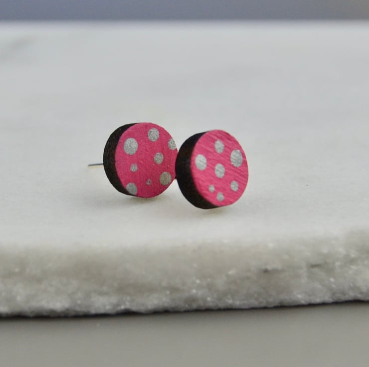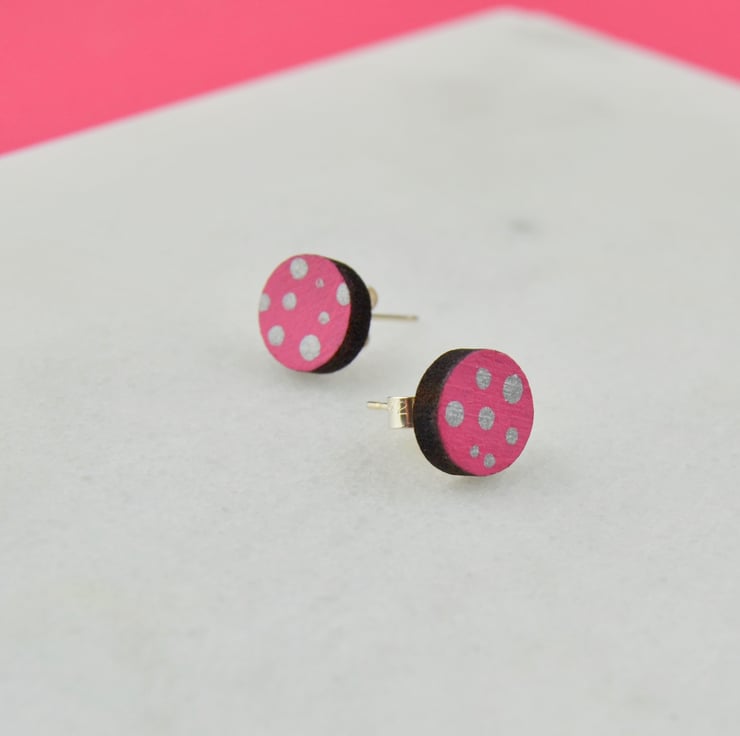 These handmade circle earrings are made from laser cut walnut wood, hand-painted in a design of varying size dots. There are two colourways - blue with gold dots or pink with silver dots.