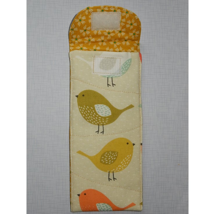 This is bright and cheery case for your glasses or sunglasses, which is made from a beautiful heavier weight cotton fabric featuring colourful birds. It has a pretty green print lining. It also has a layer of wadding for protection. The case fastens with Velcro.